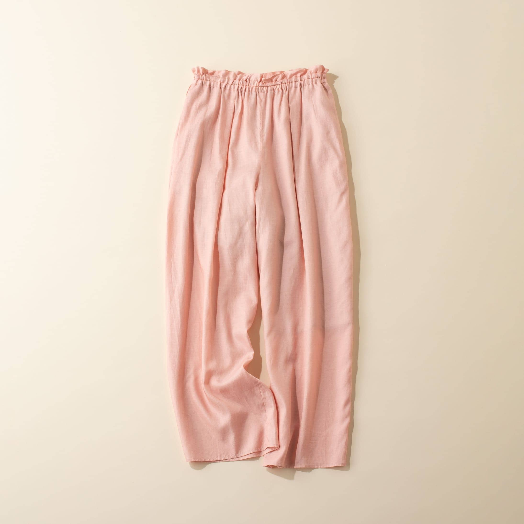 優しいピンクに癒されながら、ゆるっとリラクシーに穿けるコンフォートなパンツ。上品な艶感ピンクがリッチなムードにもマッチするから、コーデを選ばず活躍します。