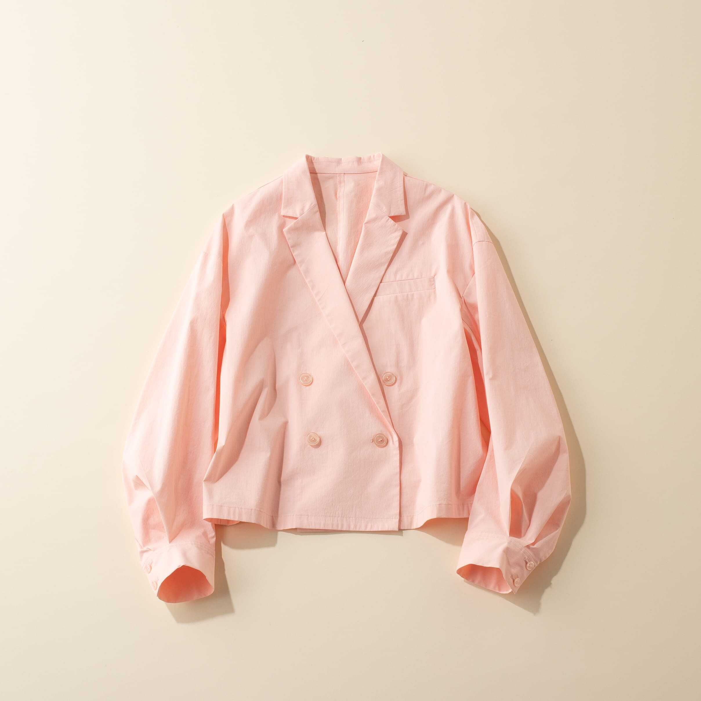 ハンサムなシャツジャケットも、ピンクを選べば女っぽさが加わり絶妙なバランス感に。ラフに羽織るのはもちろん、トップス感覚で着こなして今っぽく魅せたい。