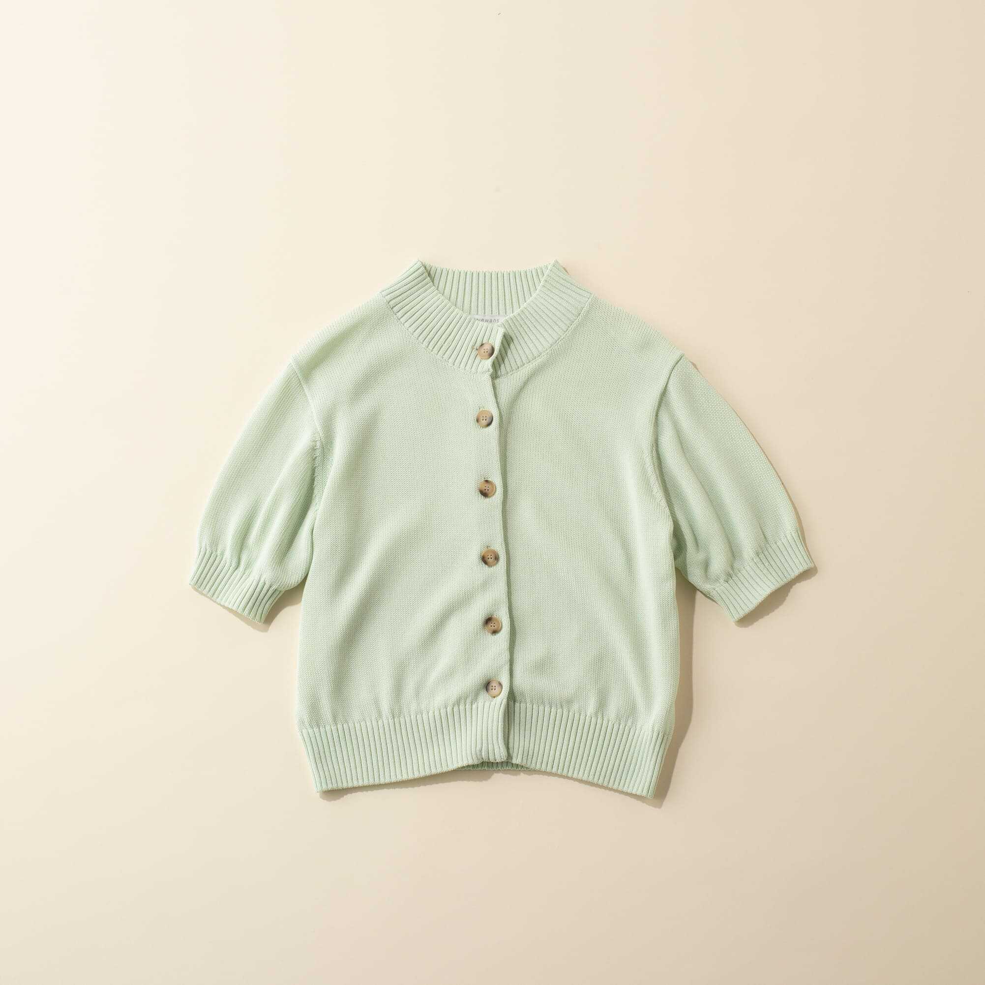 トップスとしてもカーディガンとしても、オンオフ問わず着回せる半袖ニット。上品なミントグリーンとボタンデザインが、着映えを確約してくれる1枚。