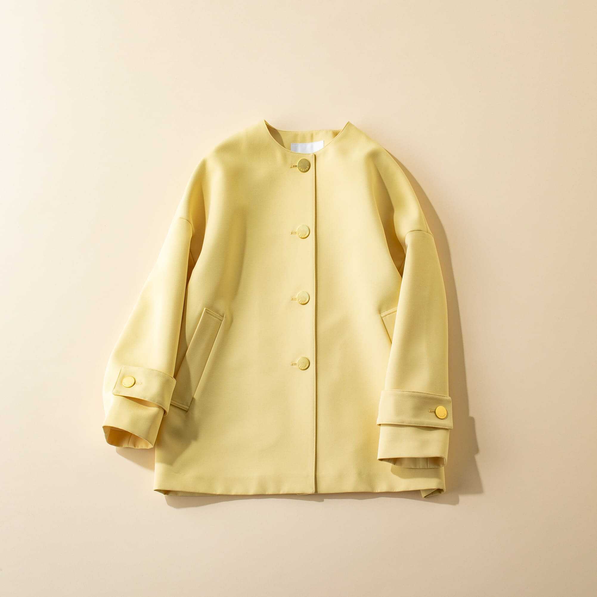 曲線フォルムと金ボタンがエレガントで華やかな佇まいの春コート。同系色のボトムスを合わせ、ワントーンを意識すれば最旬ムードを楽しめます。