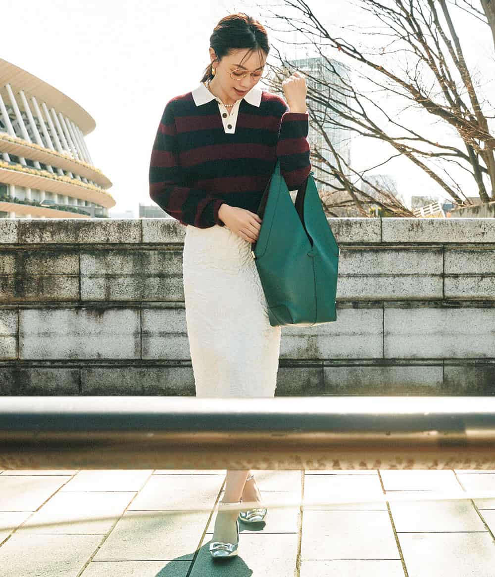 ニットポロ¥35,200シャツ¥44,000(ともにオーラリー)パンツ¥69,300(マディソンブルー)バッグ¥157,300(ピエール アルディ/ピエール アルディ 東京)スニーカー¥22,000(アシックス/アシックスジャパン カスタマーサポート部)ピアス¥27,500リング¥41,800(ともにブランイリス/ブランイリス トーキョー)