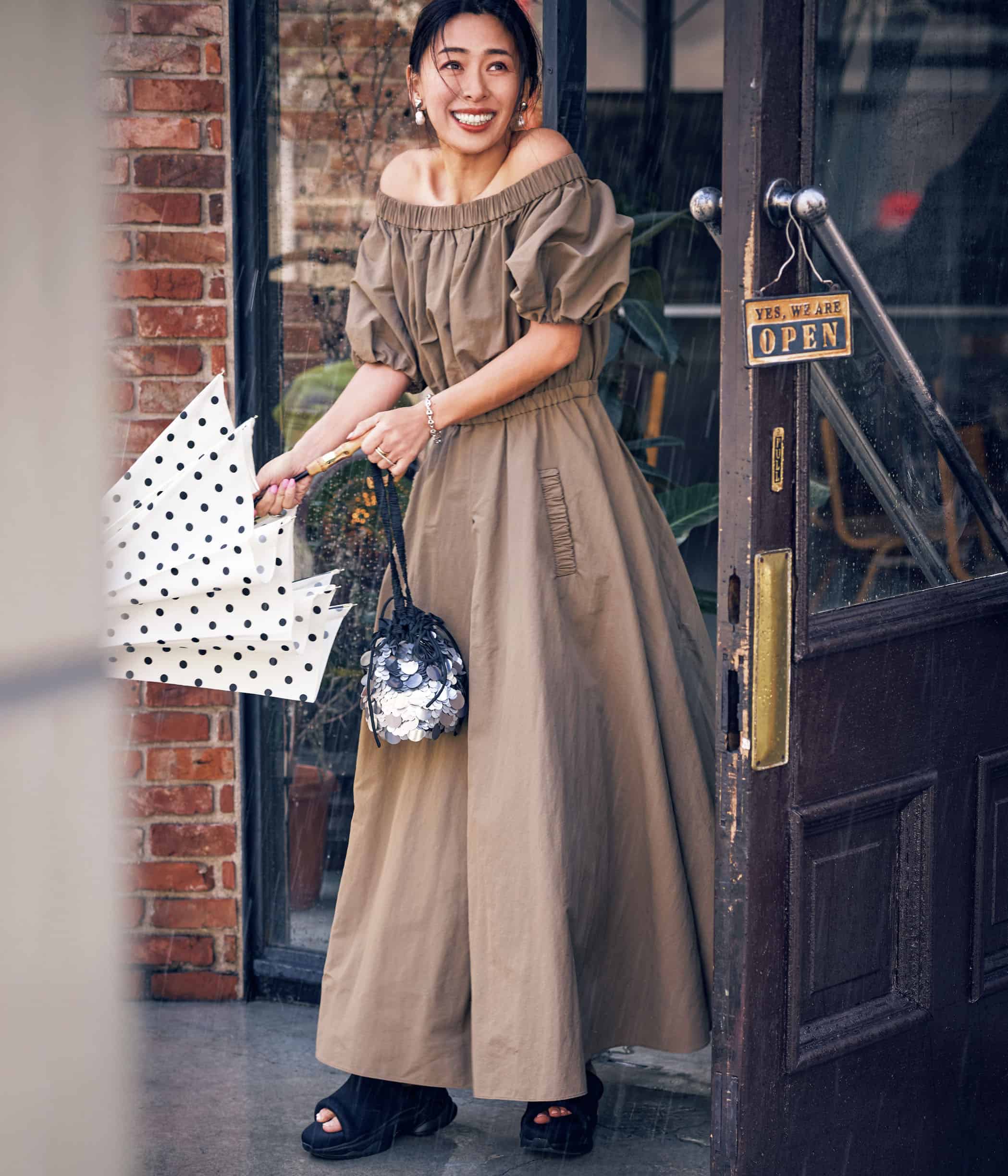 ワンピース[撥水]¥64,900(ソブ/フィルム)バッグ¥47,300(マーレット/リトルリーグ インク)サンダル¥48,400(PIPPICHIC/ベイジュ)イヤリング¥14,850(ステラハリウッド)リング¥4,950(loni)傘¥14,300(トラディショナル ウェザウェア/トラディショナル ウェザーウェア ルミネ有楽町店)