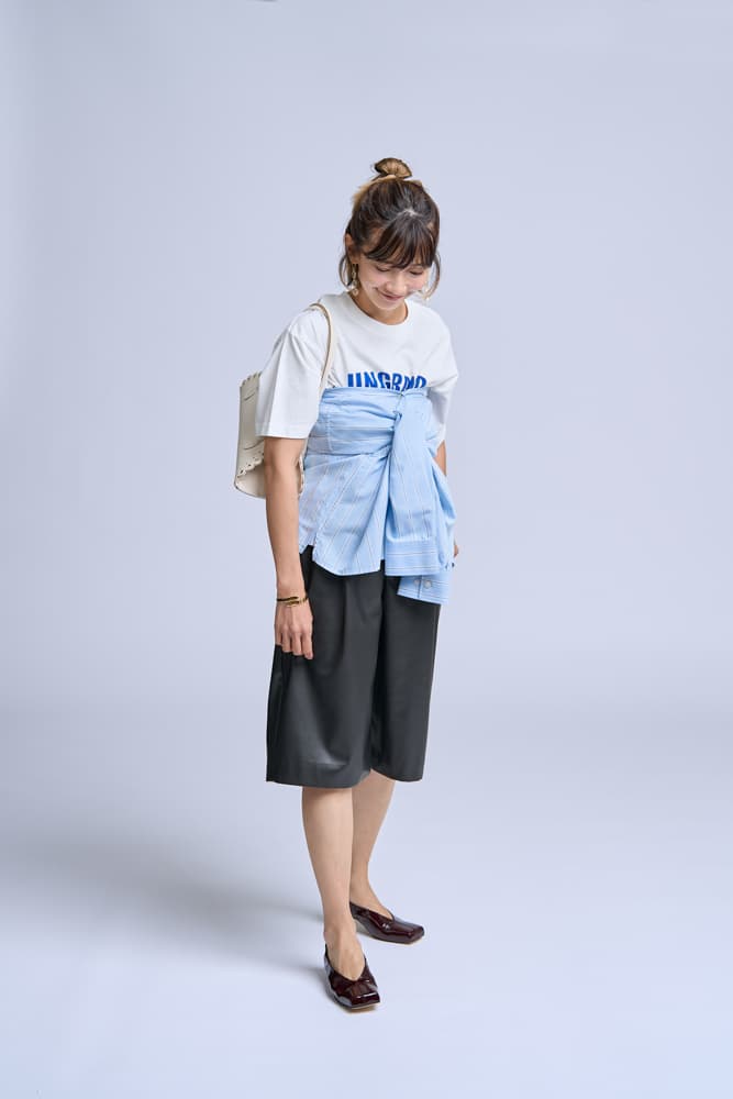 オックスフォードシャツ¥3,990(ユニクロ アンド ジェイ ダブリュー アンダーソン/ユニクロ)Tシャツ¥9,900(アルページュストーリー)パンツ¥26,400(イウエン マトフ)バッグ¥47,300(メアリー オルターナ/ユナイテッドアローズ)シューズ¥37,400(ピッピシック/ベイジュ)ピアス¥7,800<ミーナジェムス>リング¥3,900<soie>バングル¥7,150<ieLS>(すべてロードス)