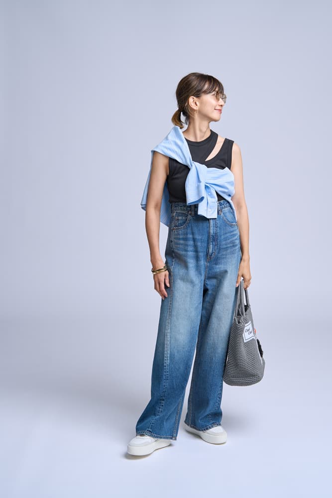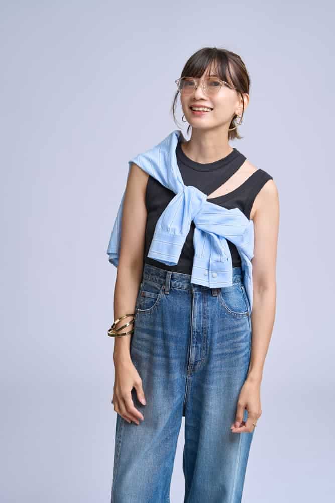 オックスフォードシャツ¥3,990(ユニクロ アンド ジェイ ダブリュー アンダーソン/ユニクロ)タンクトップ¥19,800(ハイク)パンツ¥41,800(ウィム ガゼット)バッグ¥35,200(ラドロー/ユナイテッドアローズ)シューズ¥39,600(デイト/ティースクエア プレスルーム)イヤリング¥3,300<Boite de maco>リング¥19,800<masae>(ともにロードス)バングル¥25,300(ワンエーアールバイウノアエレ/ウノアエレ ジャパン)サングラス/スタイリスト私物