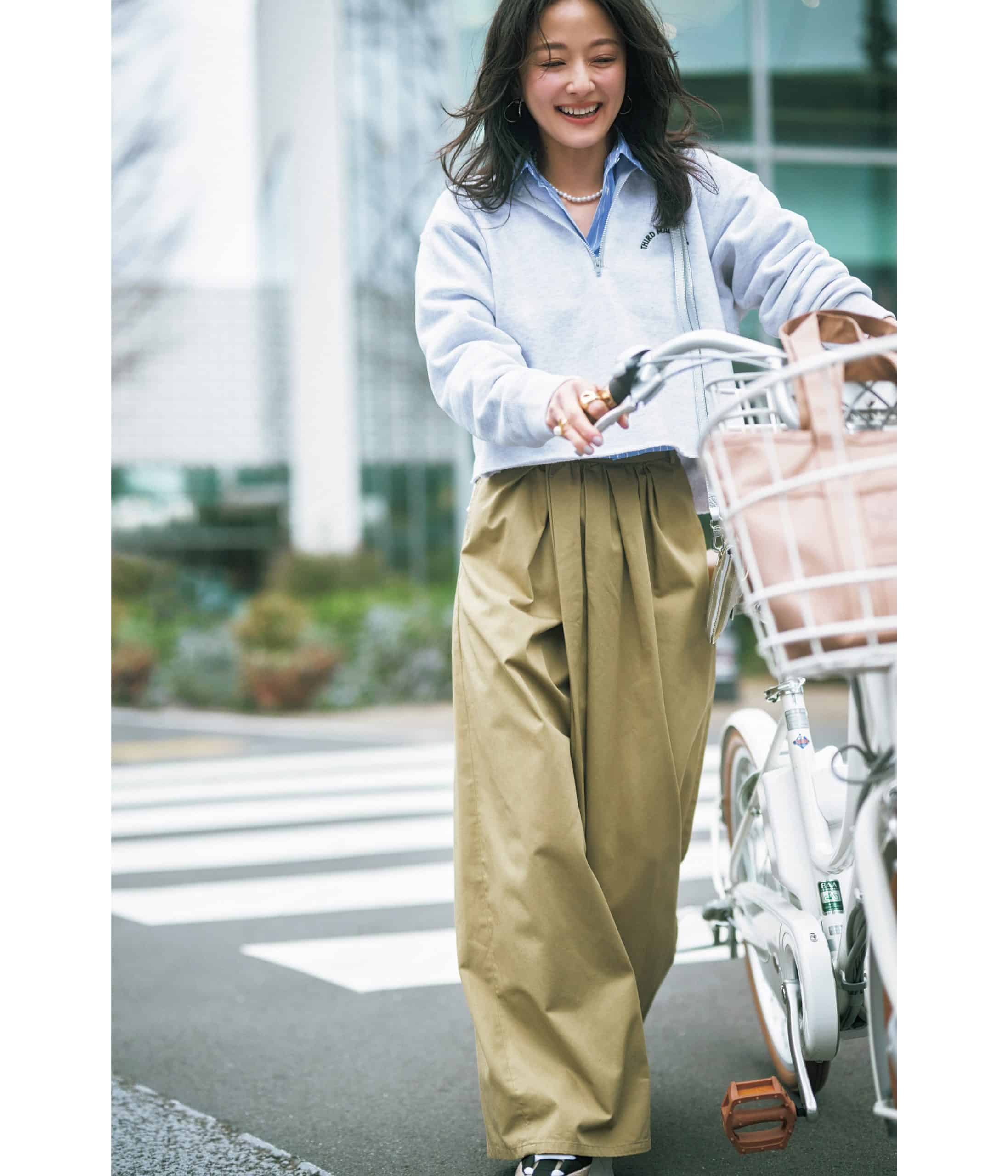 年子のママで習い事の送迎に追われる日々。自転車に乗らない日はないという中越典子さん。送迎コーデはどこかにときめく要素を仕込んで、自分らしいスタイルを楽しんでいるそう。定番のチノパンツもギャザーを寄せたラップタイプでひとひねり。ハーフジップでトレンド感をプラスしつつ、シャツやアクセでキレイめに着地。