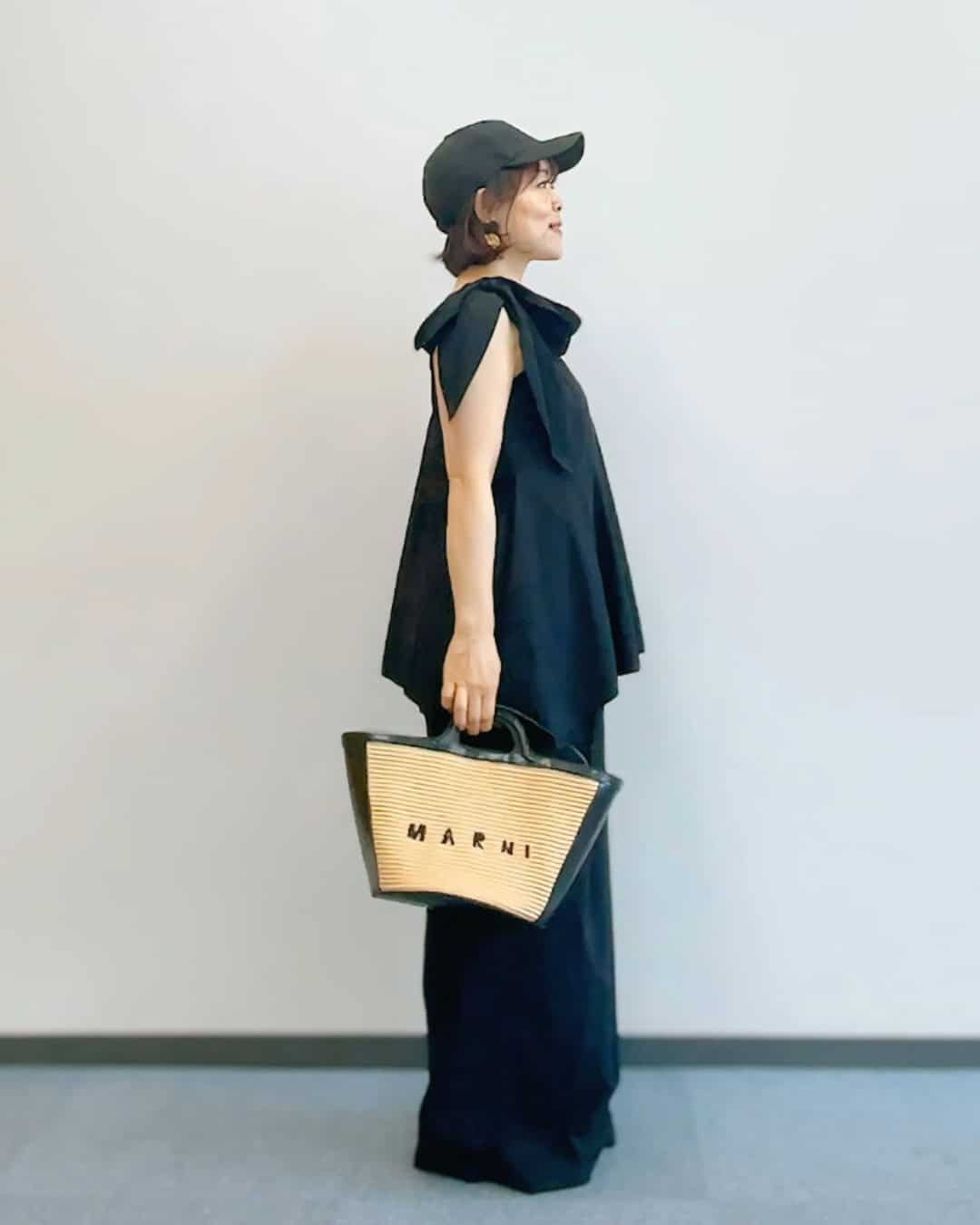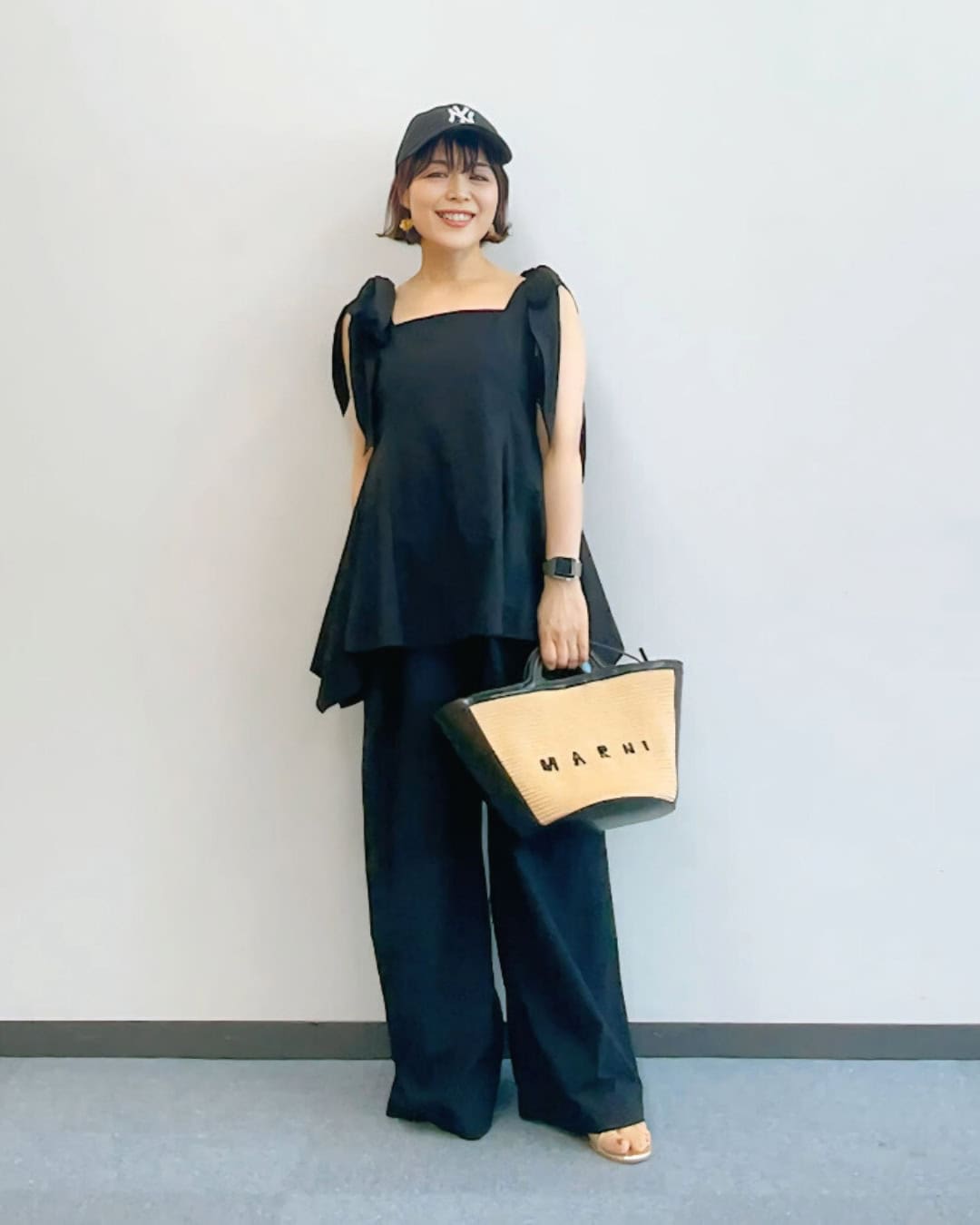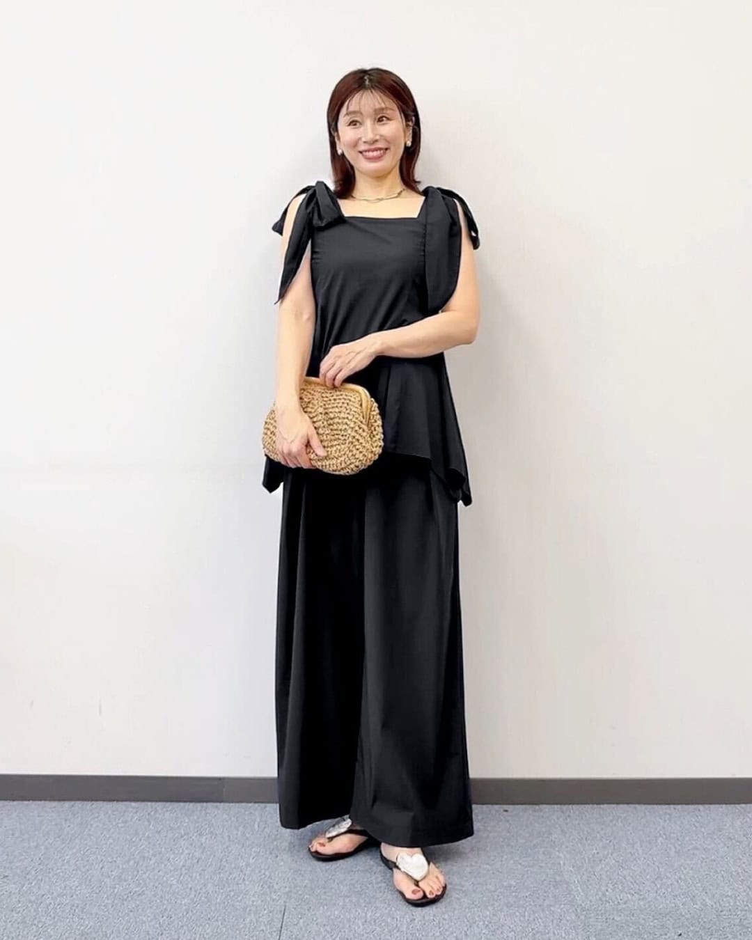 ビスチェ風のトップスとワイドパンツがドッキングしたような1枚で映えるセットアップ風コンビネゾン。肩紐の結び具合は調整可能。ブラックはSTORYだけの別注カラー。
