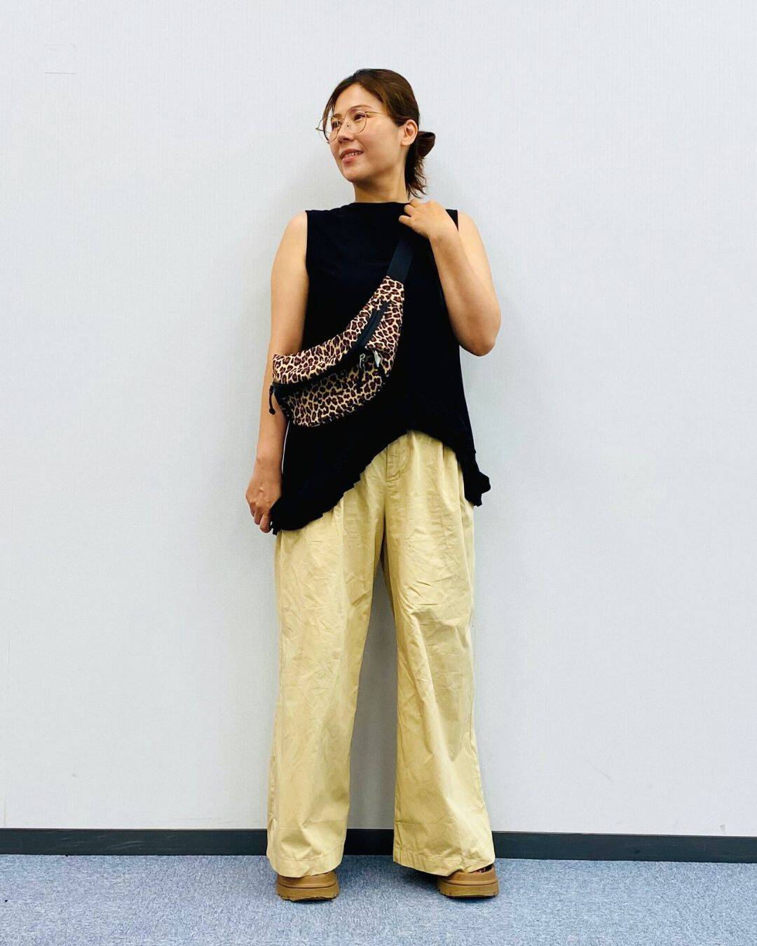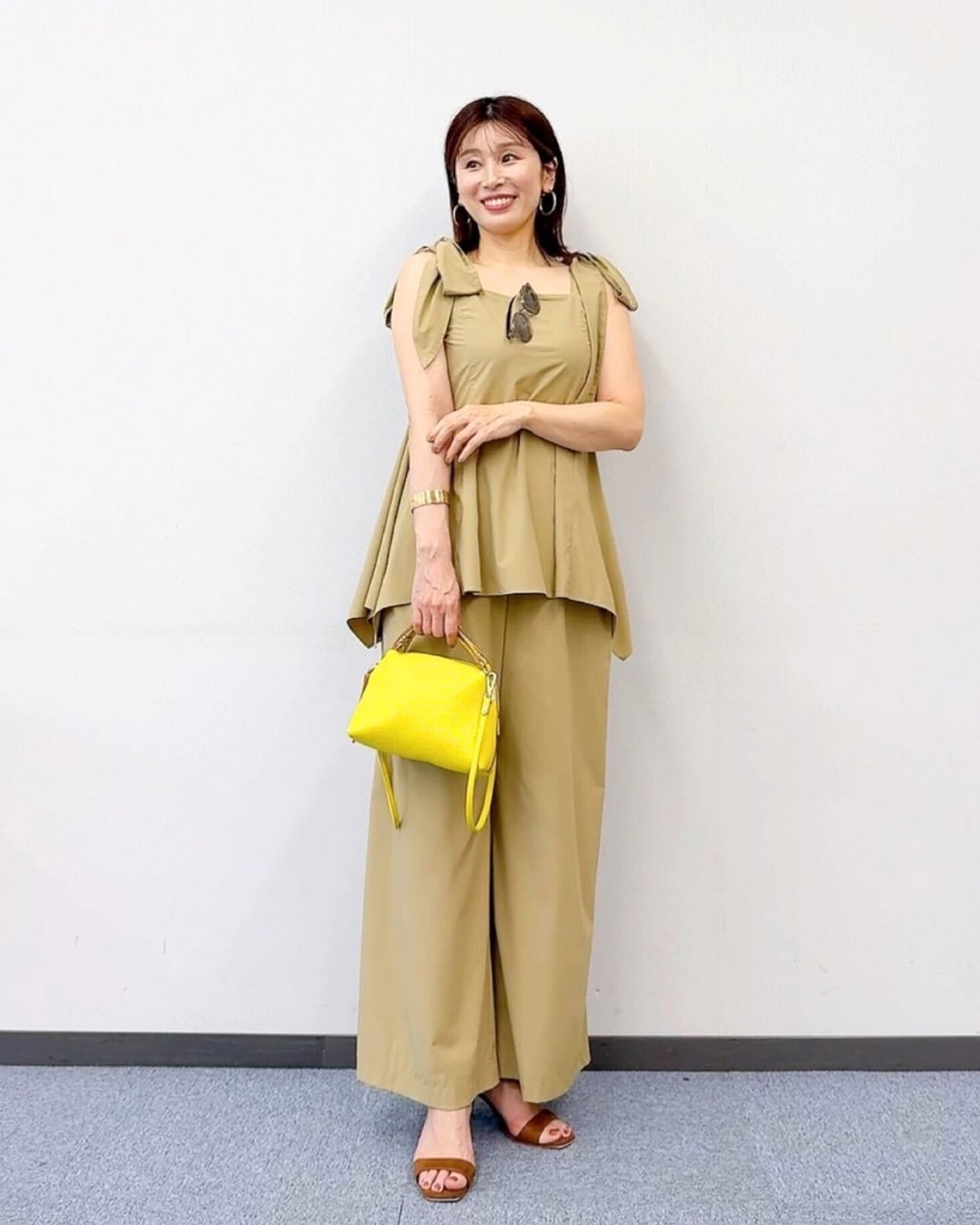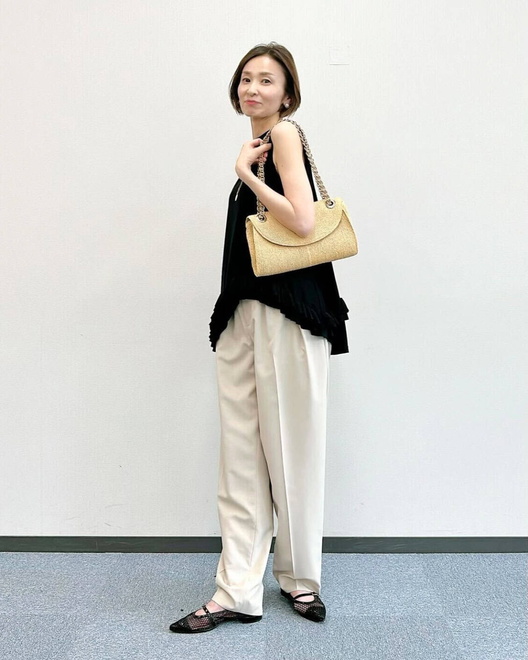 トップス¥14,800(ミュール)パンツ¥26,400(カデュネ)シューズ¥10,890(ランダ)イヤリング¥3,080〈ハクフルール〉リング¥19,800〈masae〉(ともにロードス)ブレスレット¥7,700(ワンエーアールバイウノアエレ/ウノアエレジャパン)バッグ/スタイリスト私物
