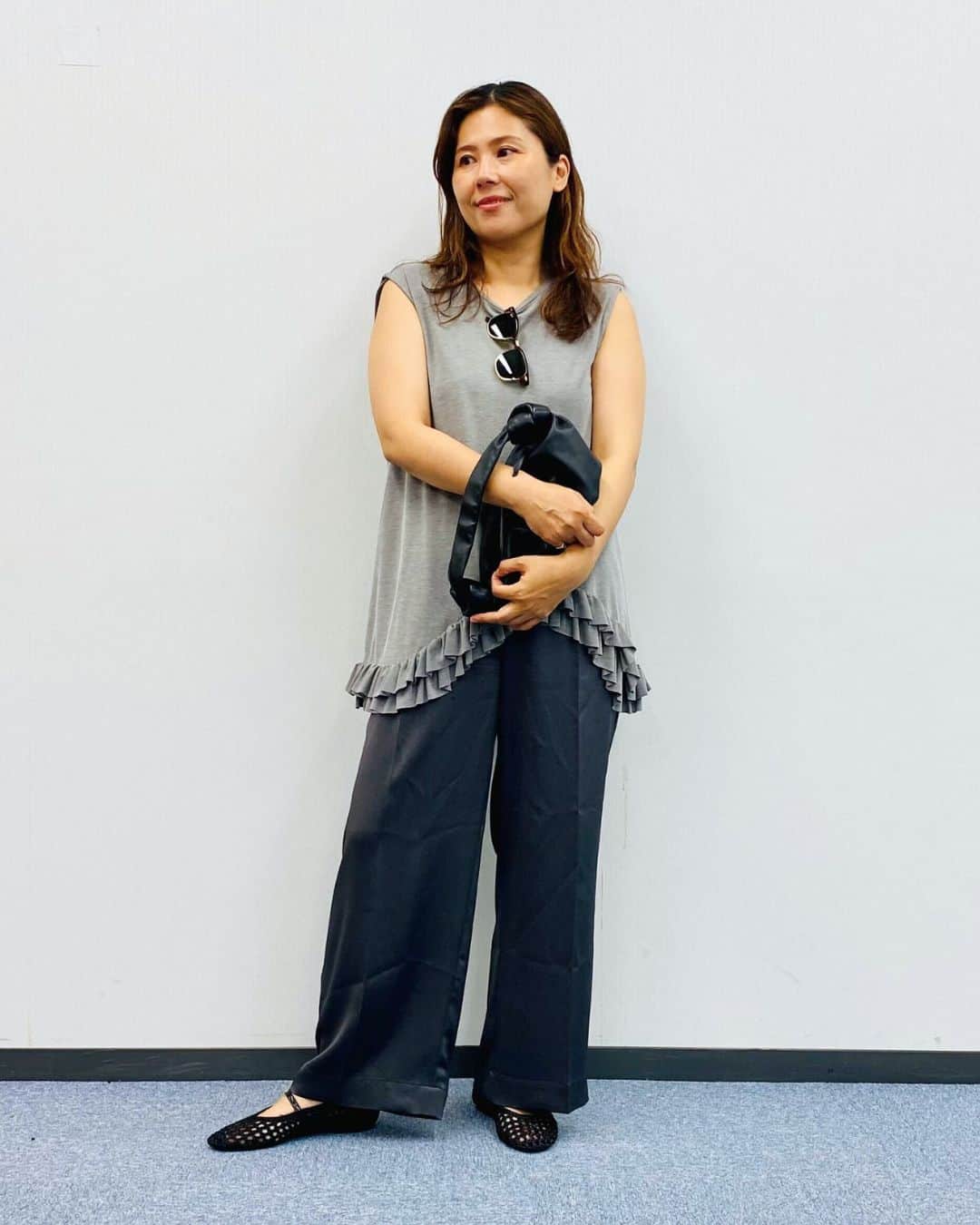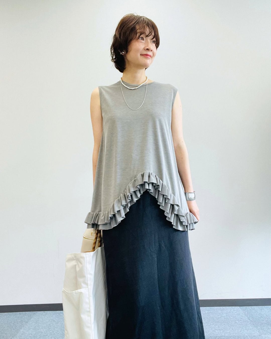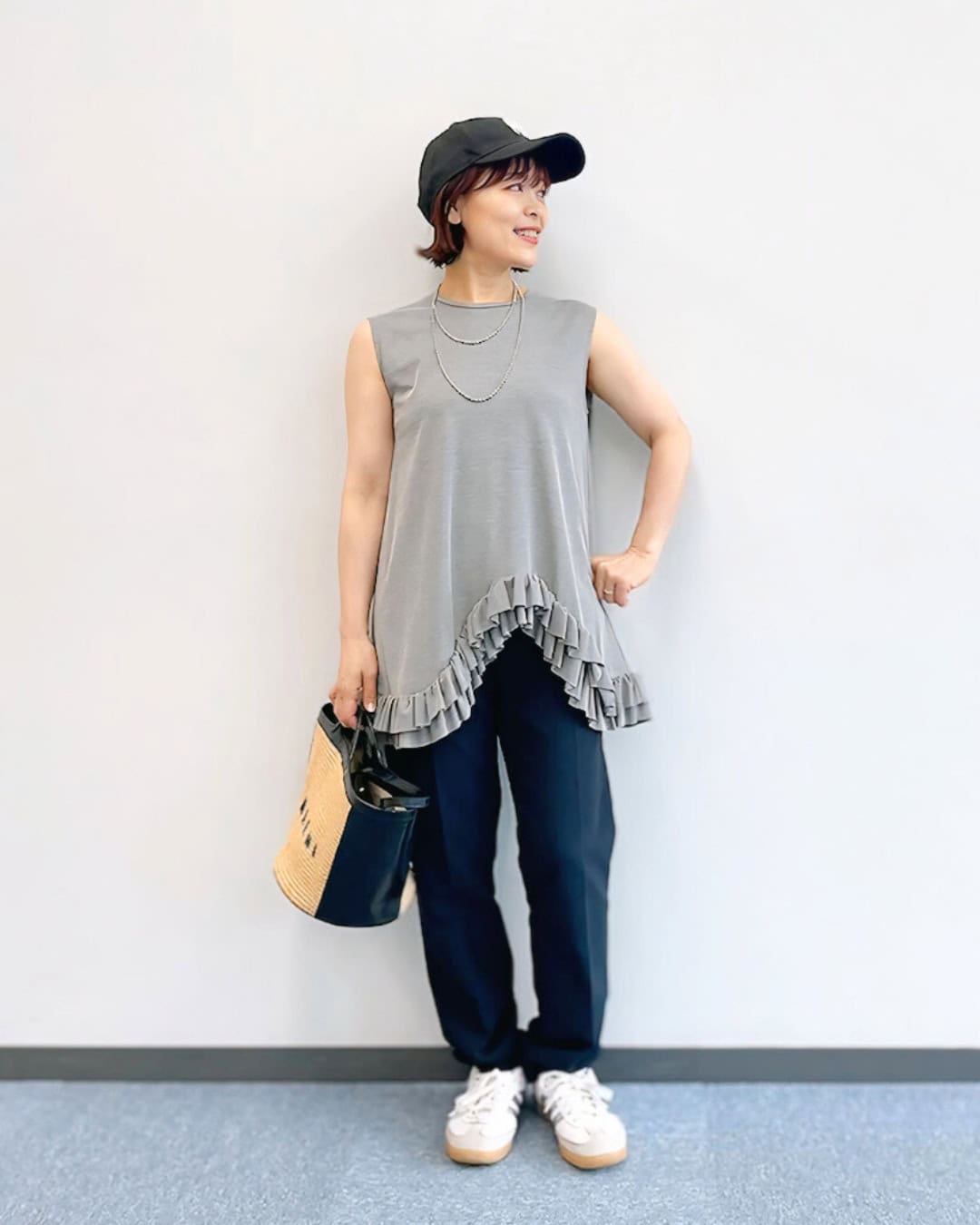 サラリとした素材で着心地のいいトップスは裾にカーブのついたフリルがポイント。裾をパンツにインしなくてもコーデが決まり、お腹もカバーできていいことだらけ。