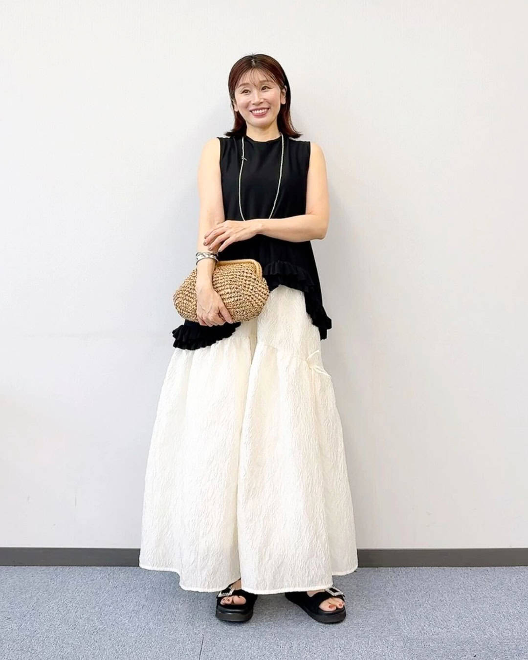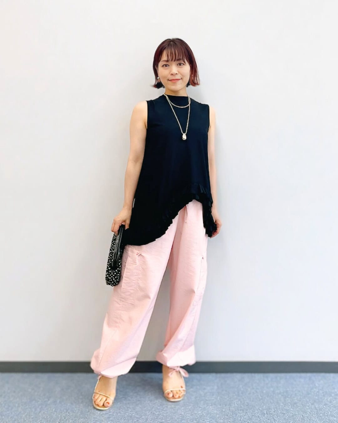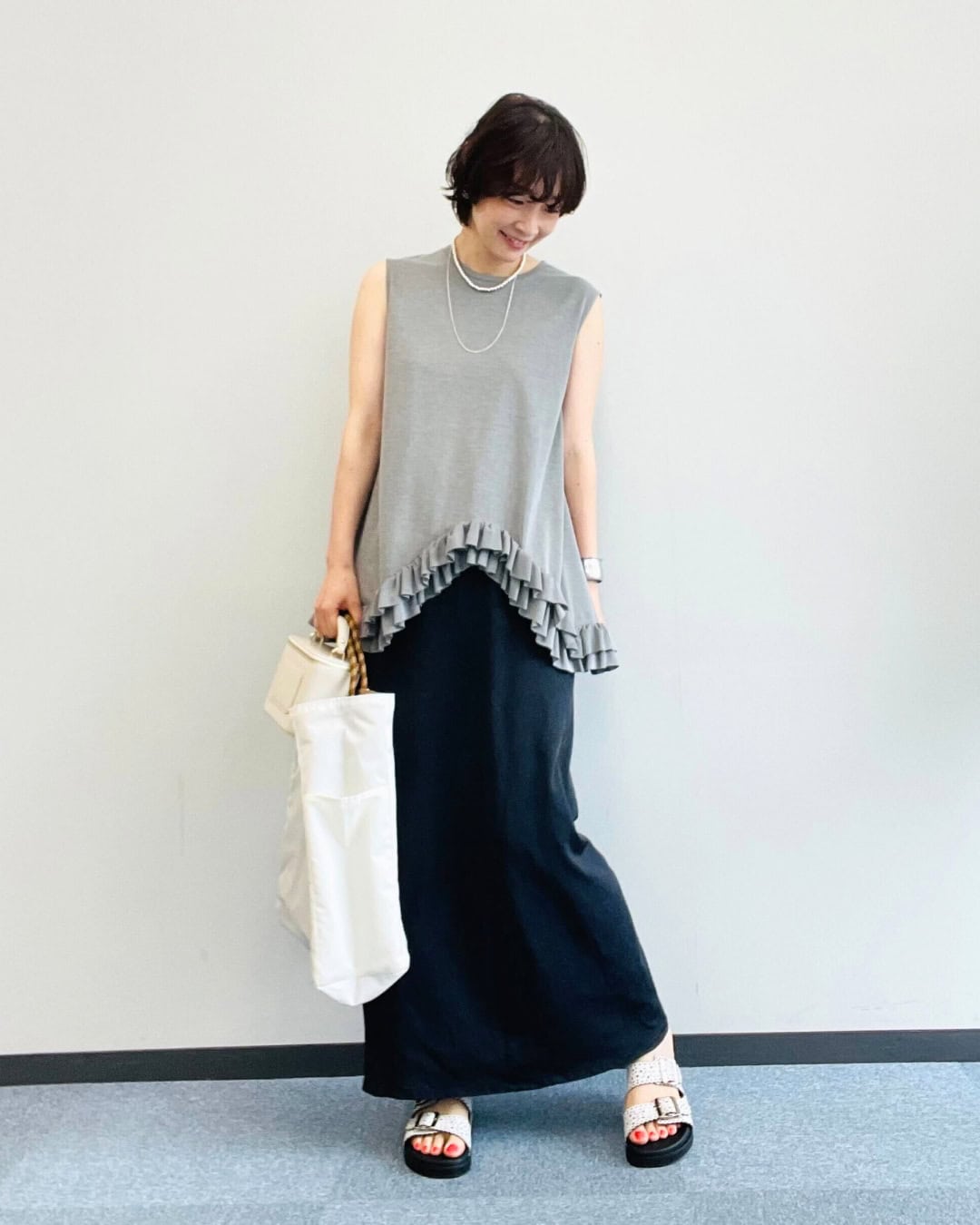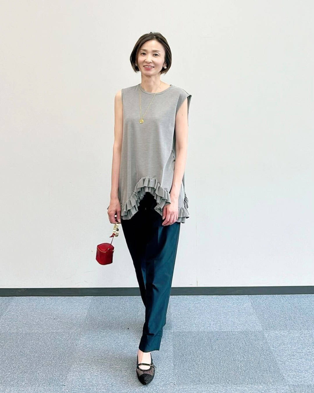 サラリとした素材で着心地のいいトップスは裾にカーブのついたフリルがポイント。裾をパンツにインしなくてもコーデが決まり、お腹もカバーできていいことだらけ。