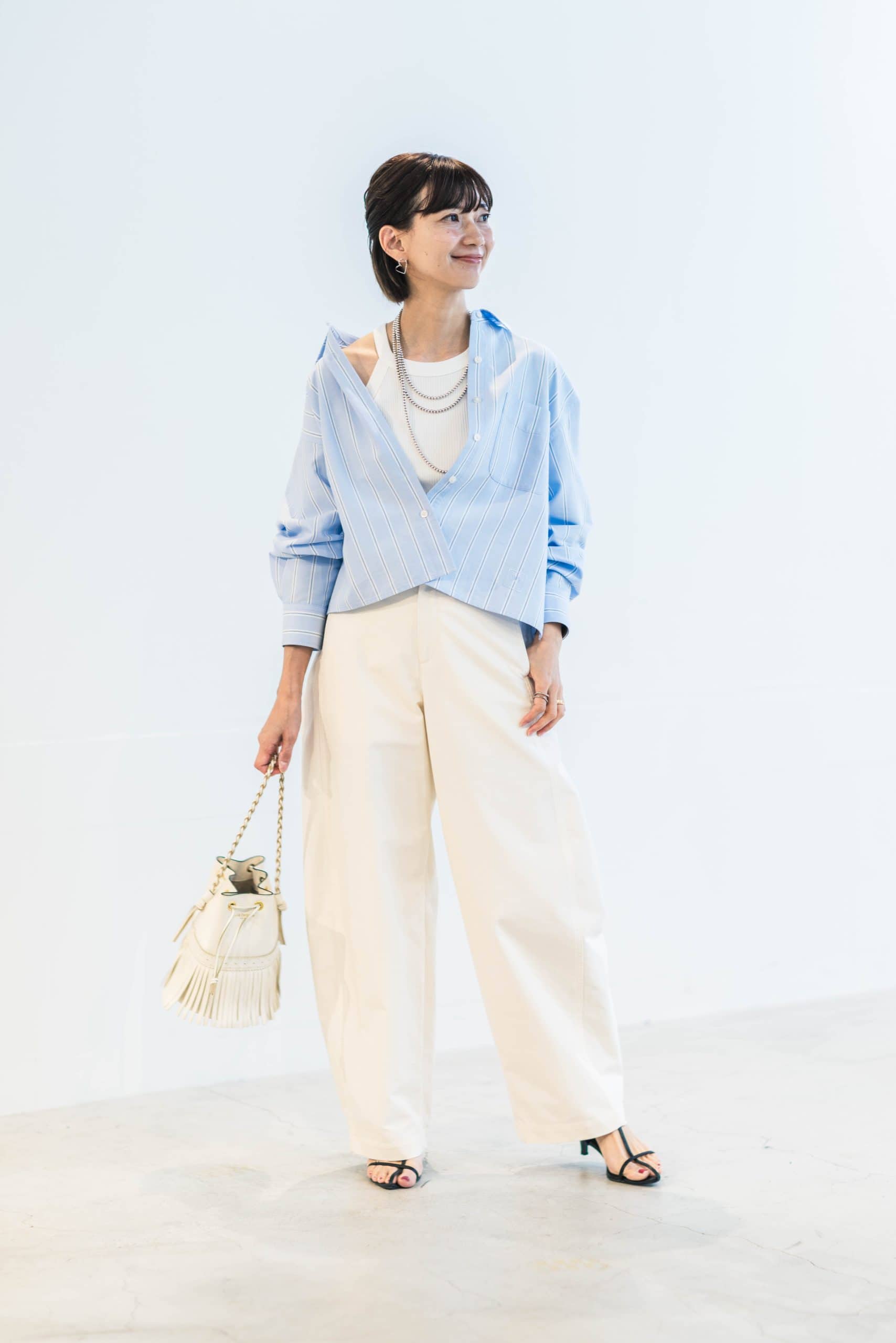 「暑いけれど日差しも気になる夏のお出かけには、シャツを羽織るスタイルがおすすめ。流行のアメスリを合わせて抜け感を出せば涼しげな印象に。バレルレッグパンツはウエストからヒップにかけてスッキリとしたシルエットで、程よいカーブラインは肌離れも良く快適に着られます。サイズ展開も豊富なので、自分好みのシルエットに挑戦できるのも嬉しいポイントです。」