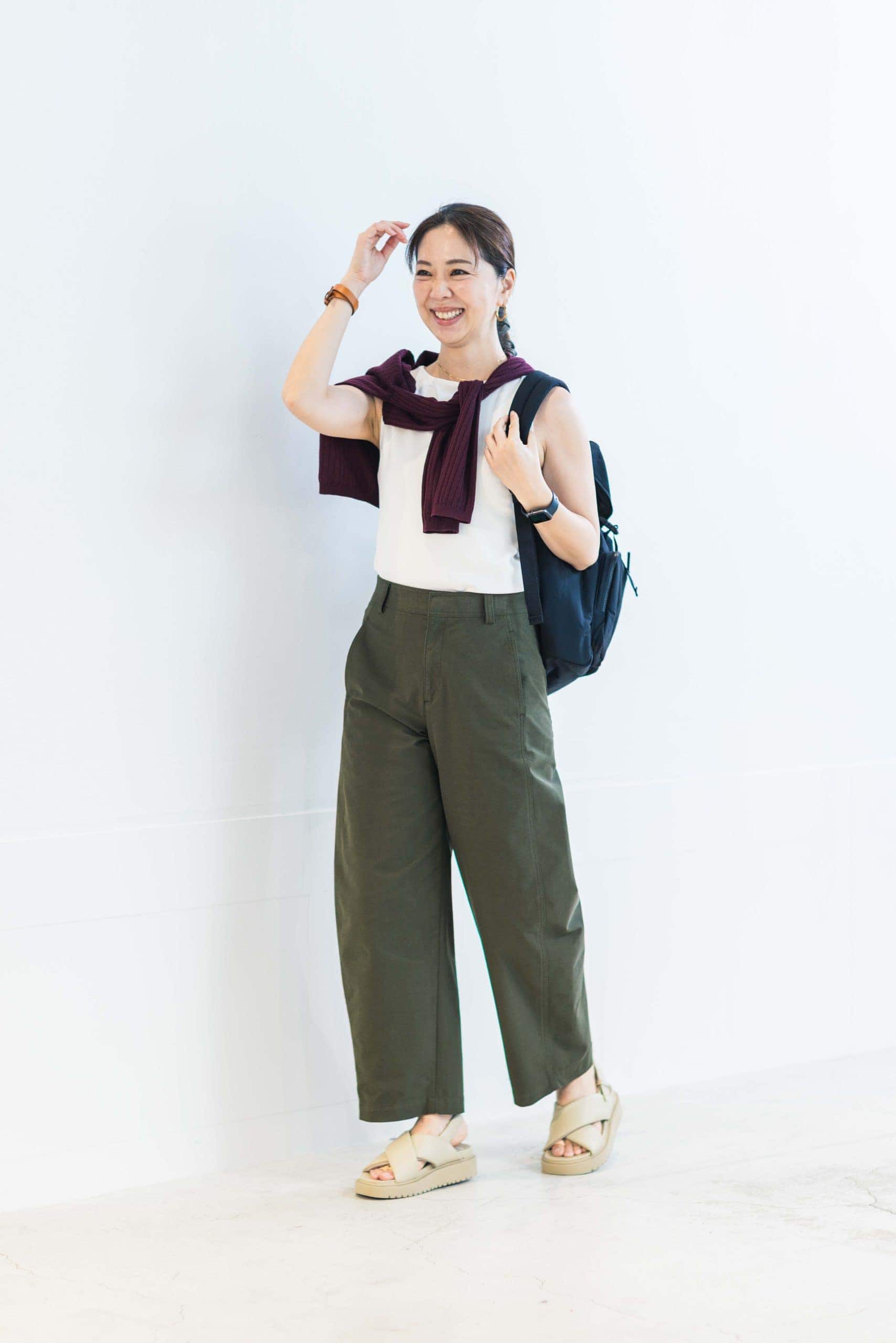 ジャージーバレルレッグパンツ¥3,990 メリノリブクルーネックショートカーディガン¥3,990 クレープジャージーボートネックTノースリーブ¥1,500 マルチポケットバックパック¥4,990(すべてユニクロ/ユニクロ)クロスストラップサンダル¥2,990(ユニクロ:シー/ユニクロ)※すべてMサイズ着用