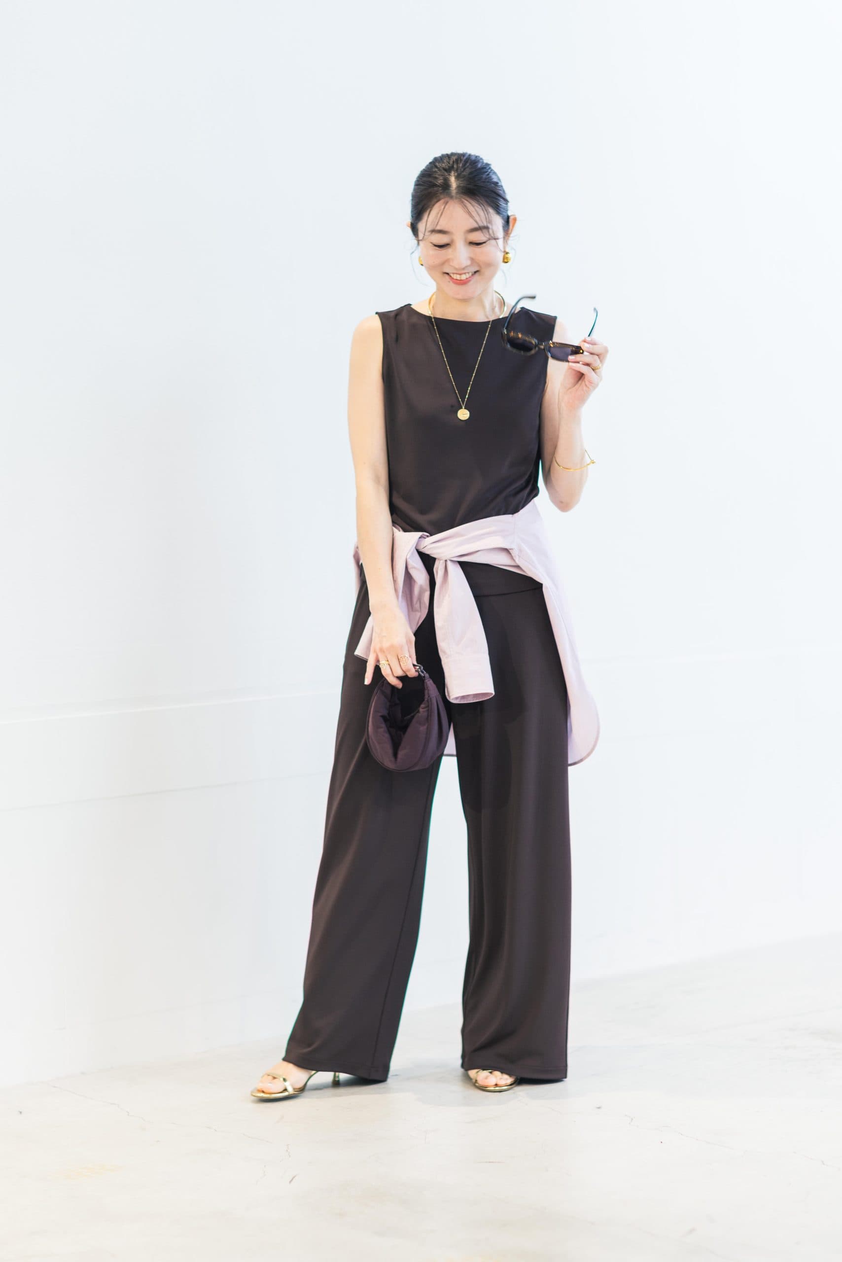 「ボートネックタイプのトップスと、フルレングスのストレートパンツはセットアップで持っておくと着回しの幅も広がりそう。嬉しいドライ機能付でサラッと快適。ウエスト部分はゴムでストレッチが効いたクレープジャージー素材なのでシワにもならず着心地も抜群!初夏の新緑にも映えそうなブラウンカラーをチョイスして、ノンストレスなセットアップで軽井沢ドライブを楽しみたい!」