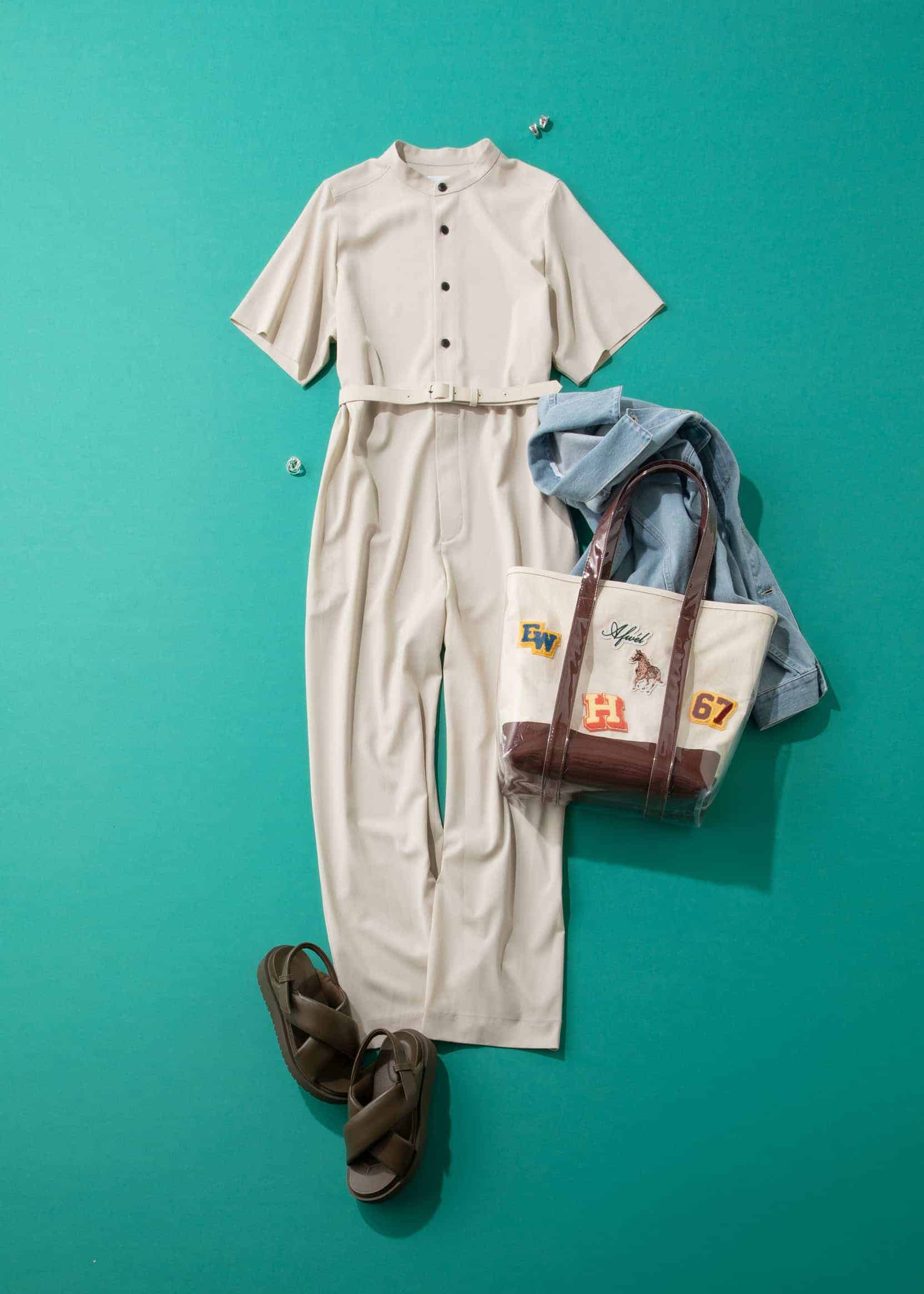 移動時間もリラックスして過ごせるオールインワンは旅行に外せないアイテム。ガシガシ歩ける靴はリラクシングなコーデの引き締め役に◎。涼しげな淡いカラーでまとめたらインパクトあるBIGバッグでポイントを!