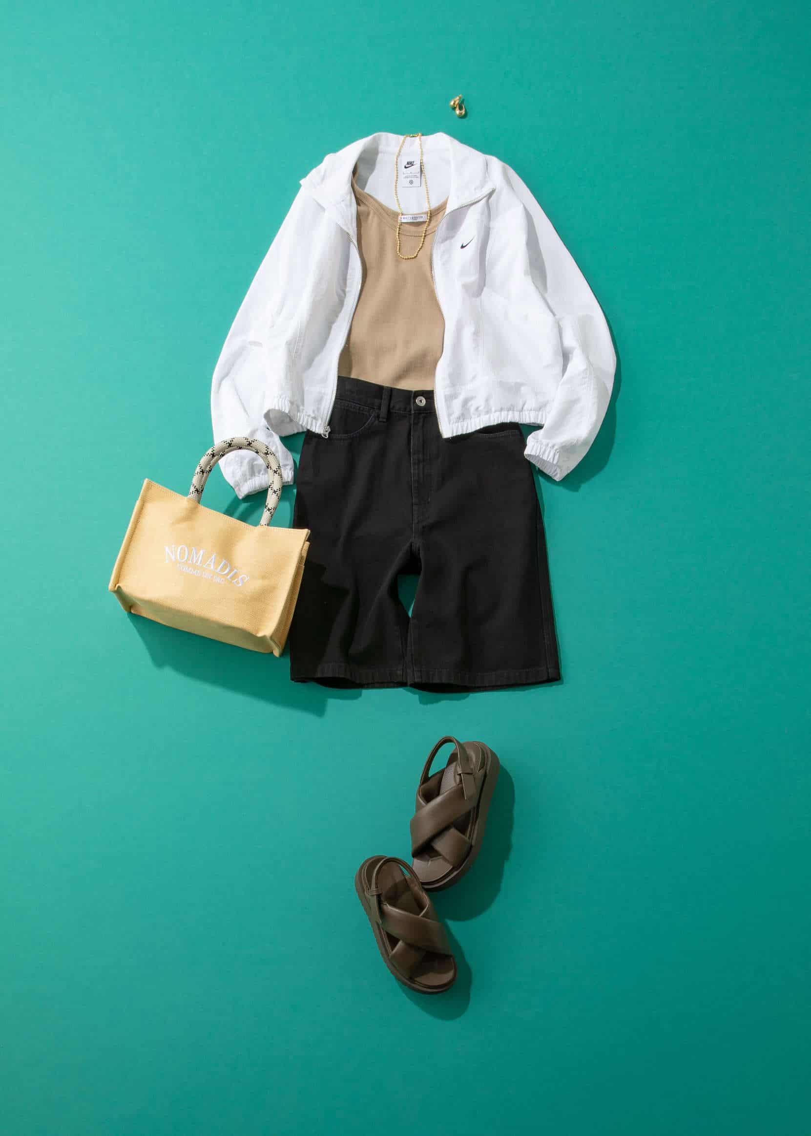 シューズは履き回し。ブルゾン¥10,600(ナイキ スポーツウェア/ナイキ)タンクトップ¥4,950(ビューティ&ユース ユナイテッドアローズ)バッグ¥16,500(ノマディス/シップス)ピアス¥74,800(ミチ ウィルウェイ/フォーティーン ショールーム)ネックレス¥16,500(ワンエーアールバイウノアエレ/ウノアエレ ジャパン)