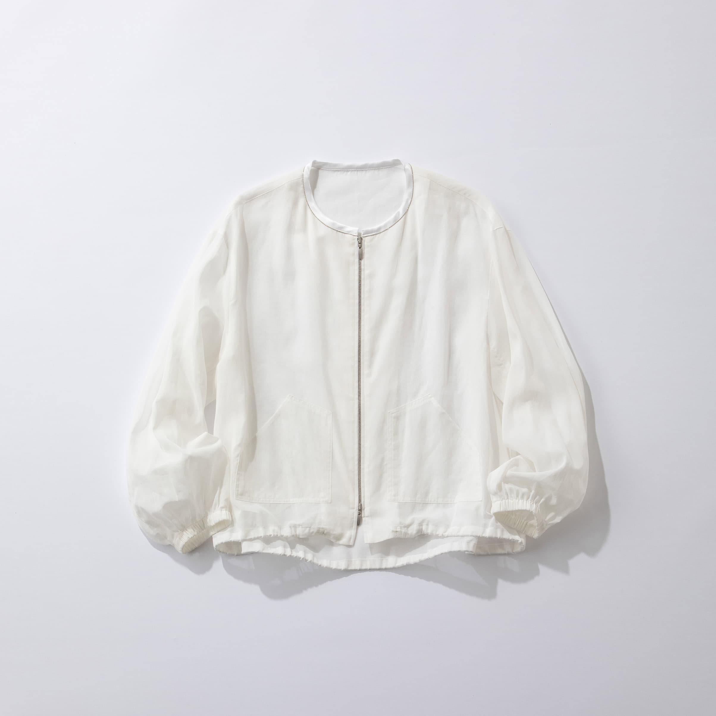 今季豊作なシアーブルゾンは体温調節にうってつけ!こちらは首元のシルバーのパイピングが効いていてきれいめにも着られます。シャツ感覚でいつでもどこでも羽織れて、持ち運びもしやすいので旅行にもおすすめ。透け感のある白なら長袖でも重くなりません。爽やかに夏を満喫できる1枚です。