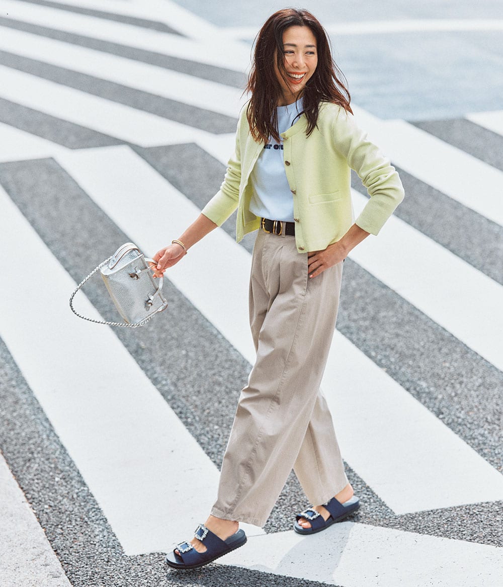 パンツ¥19,800(アルページュストーリー/アルページュストーリー プレスルーム)ニットカーディガン¥11,880(SNIDEL/SNIDEL ルミネ新宿2店)Tシャツ¥11,000(TOMORROWLAND × Les Petits Basics/TOMORROWLAND)バッグ¥53,900チェーンストラップ¥9,900(ともにジャンニ キアリーニ/ジャンニ キアリーニ 銀座店)サンダル¥34,100(ツル バイ マリコ オイカワ)シルバーバングル¥19,250ゴールドバングル¥14,520(ともにチビ・ジュエルズ/チビジュエルズ ジャパン)ベルト¥29,700(アロー)