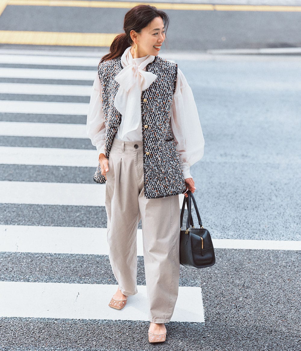 パンツ¥19,800(アルページュストーリー/アルページュストーリー プレスルーム)ツイードジレ¥88,000(ドローイング ナンバーズ/ドローイング ナンバーズ 新宿店)ボウタイブラウス¥25,300(ウィム ガゼット/ウィム ガゼット 玉川髙島屋S・C店)バッグ¥209,000(J&M デヴィッドソン/J&M デヴィッドソン カスタマセンター)パンプス¥39,600(ピッピシック/ベイジュ)ピアス¥43,780(ソコ/ZUTTOHOLIC)