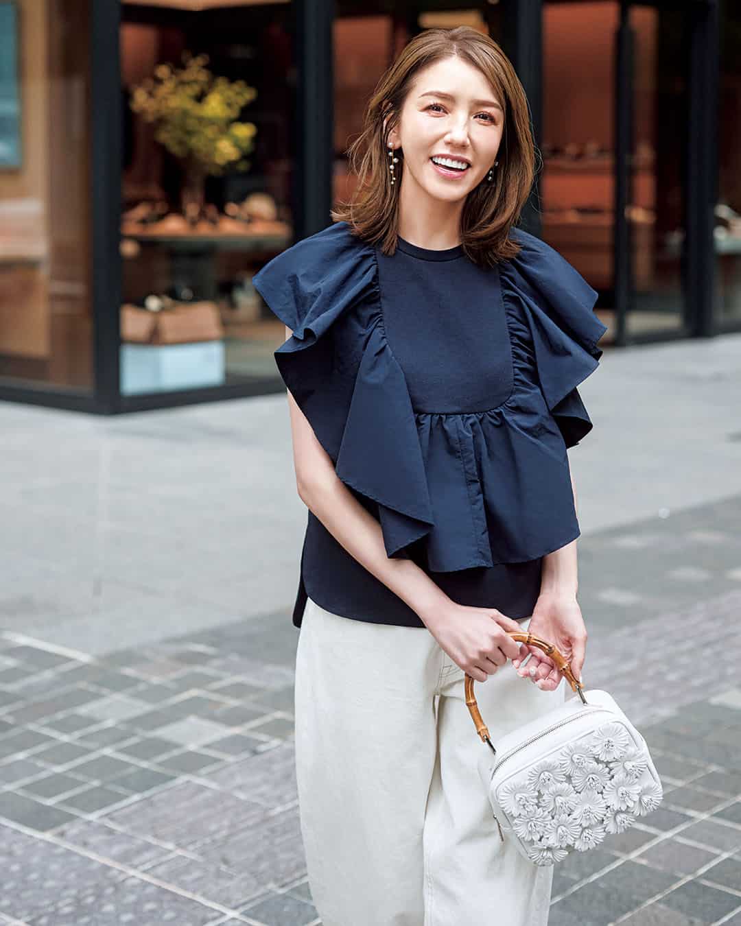 ②大胆フリルの「即戦力トップス」でワンツーコーデが映える!