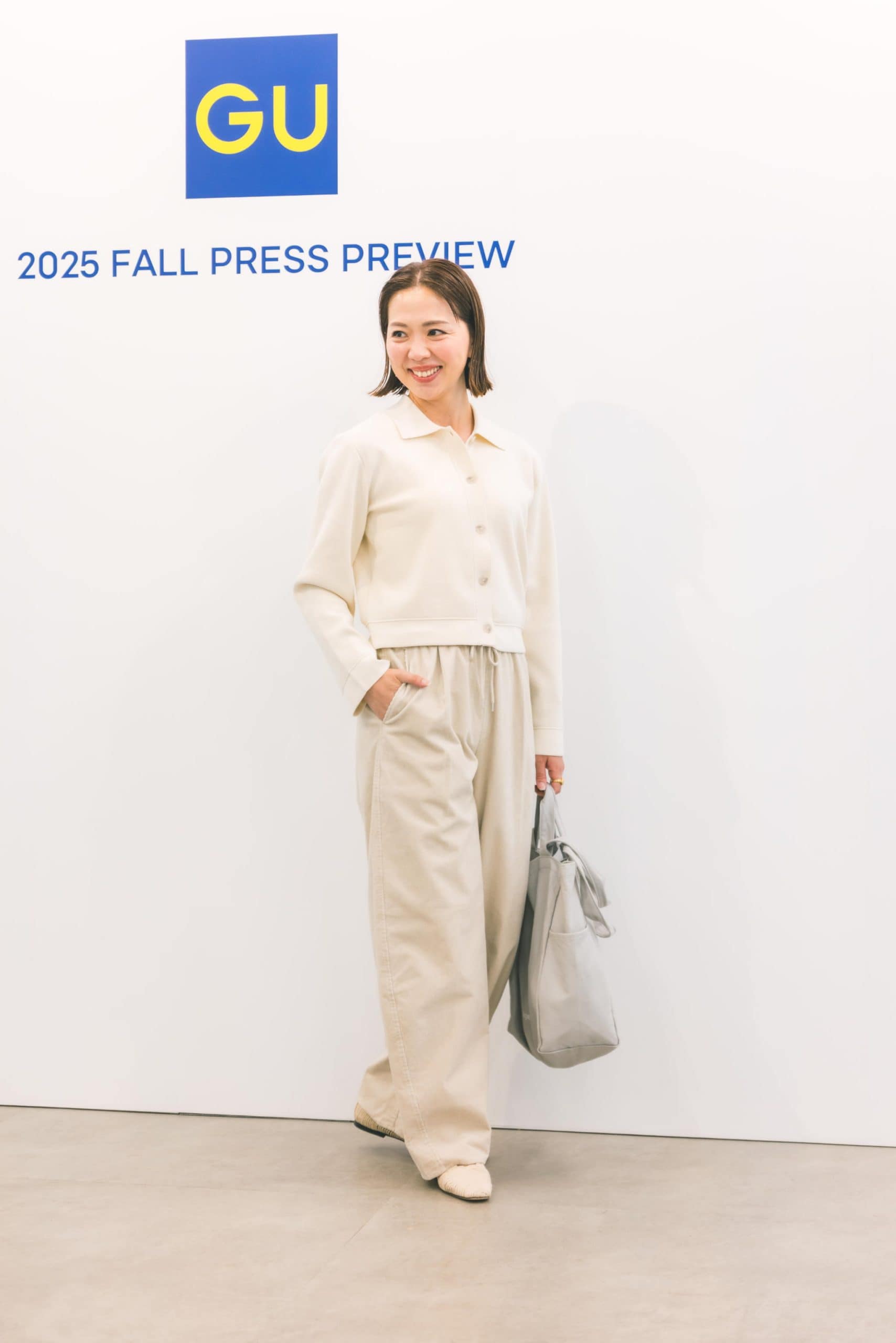 ミラノリブポロカーディガン[7月上旬発売予定]¥2,990 コーデュロイバレルレッグイージーパンツ[9月中旬発売予定]¥2,990(ともにジーユー)※ともにMサイズを着用 バッグ、シューズ(ともに私物)