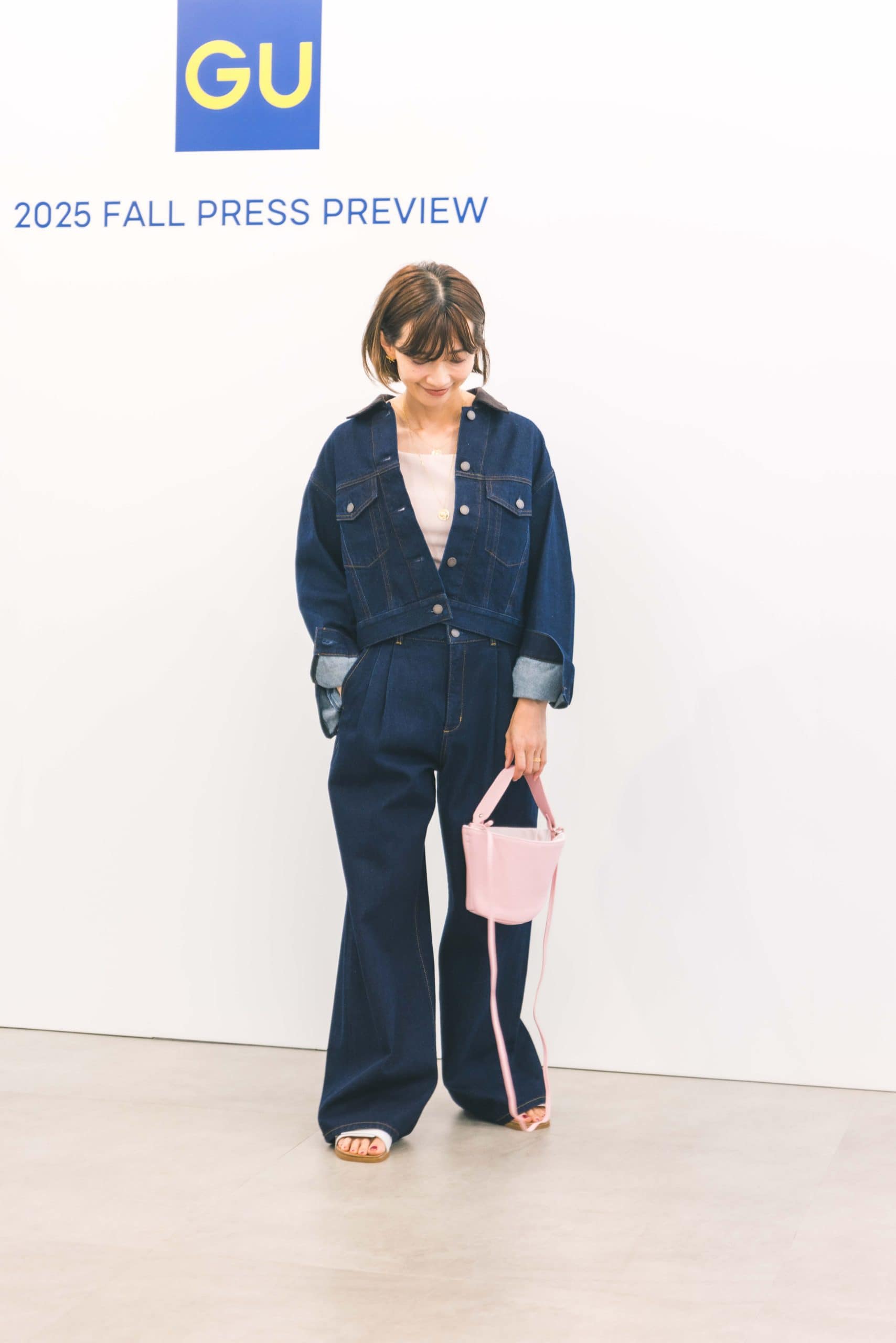 ブラフィールクロップドベロアキャミソール¥1,290 デニムタックトラウザー¥2,990 デニムジャケット¥3,990(8月下旬発売予定)(すべてジーユー)※すべてMサイズ着用 靴 バッグ(私物)