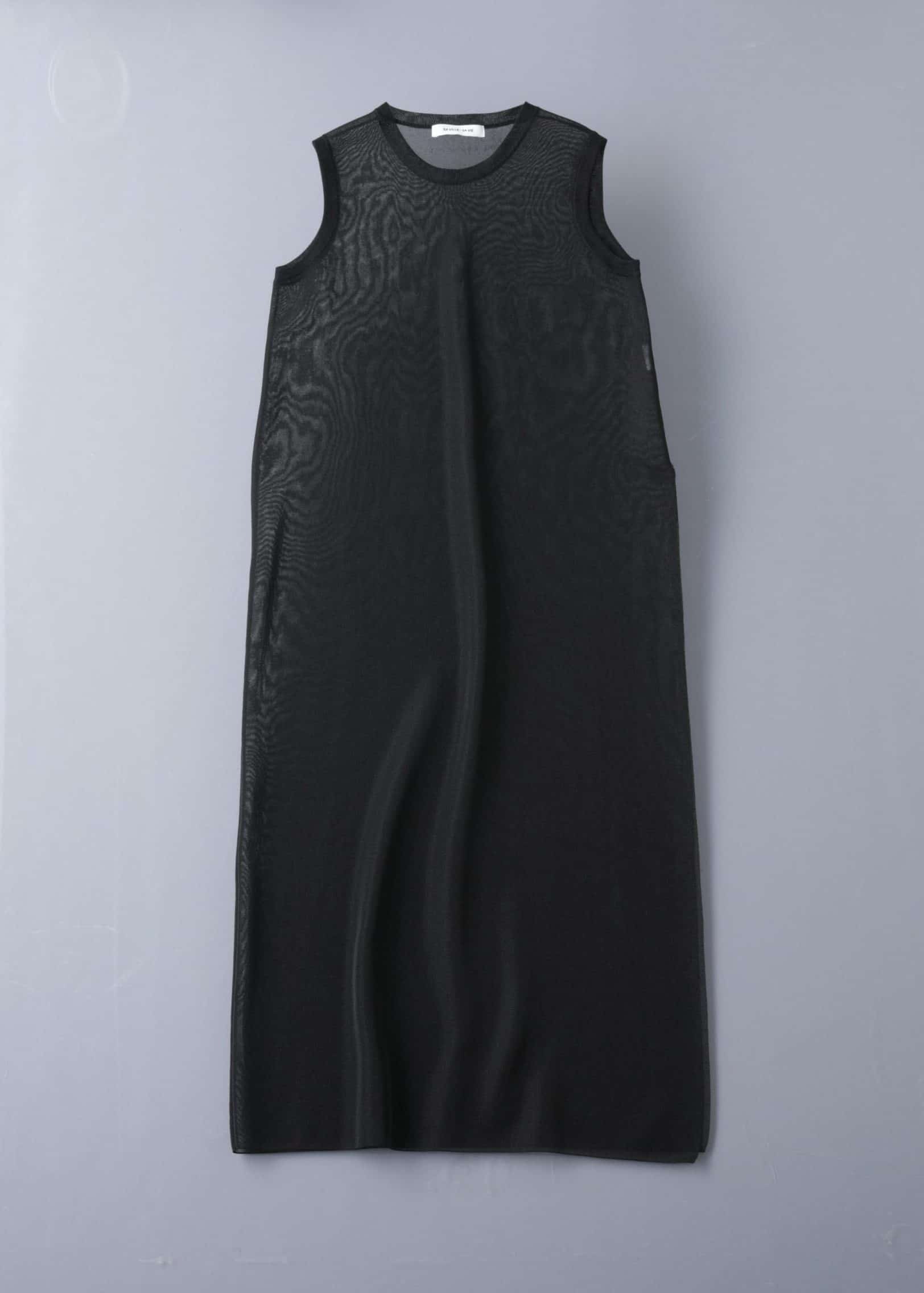 シアーなミラノリブのワンピースで、潔い透けっぷりがとってもオシャレ。例えばビスチェをインナーに入れてもいいし、上からも重ねられる。パンツはもちろんのこと、ミニスカートを穿いても面白いと思います。生足を出す勇気はないけれど、シアーワンピを1枚重ねることで、ミニスカにも挑戦できる。ロング丈のジャケットを着て、足元を透けさせるのも素敵。ありきたりではないレイヤードが楽しめるのがこのシワーワンピの魅力。夏に大人の透けを楽しめそうな1枚です。