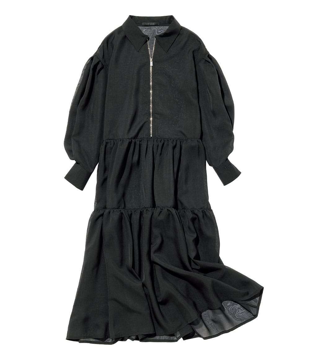 シアー素材なら長袖でも涼やか。程よいボリュームのパフスリーブとティアードデザインをジップ使いでハンサムな表情に。ワンピース¥77,000(タトラス/タトラス 銀座店)