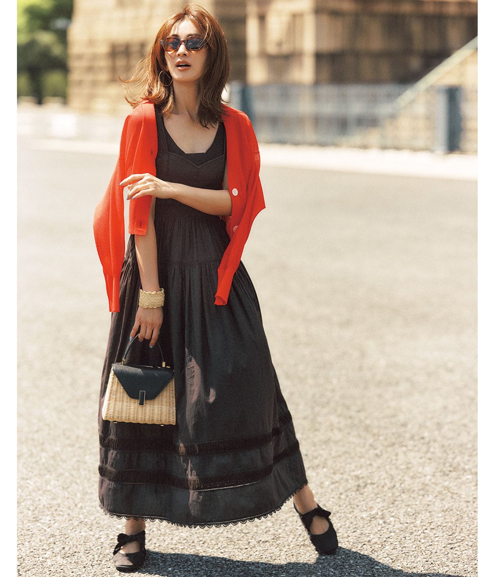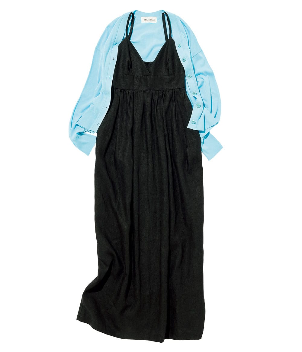 リネン素材の黒ワンピにミントブルーのカーデ。ブルべさんにおすすめ。ワンピース¥37,400(プルミエ アロンディスモン)カーディガン¥44,000(デパリエ/デパリエ 伊勢丹新宿店)