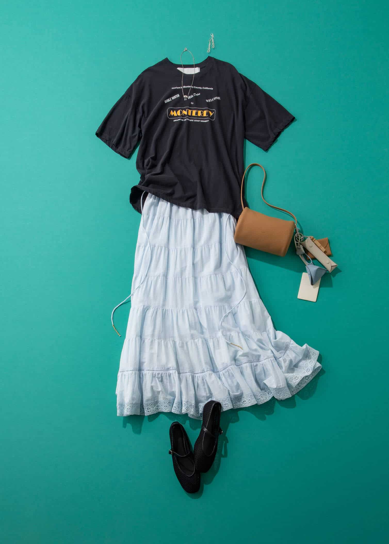 シューズ¥10,780(ル タロン)Tシャツ¥9,790(ティッカ)スカート¥20,900(マイストラーダ)バッグ¥19,800(アドカラム/アンソロジー)イヤリング¥2,860<ハクフルール>リング¥3,520<ヘンカ>(ともにロードス)バングル¥7,700(ワンエーアールバイウノアエレ/ウノアエレ ジャパン)