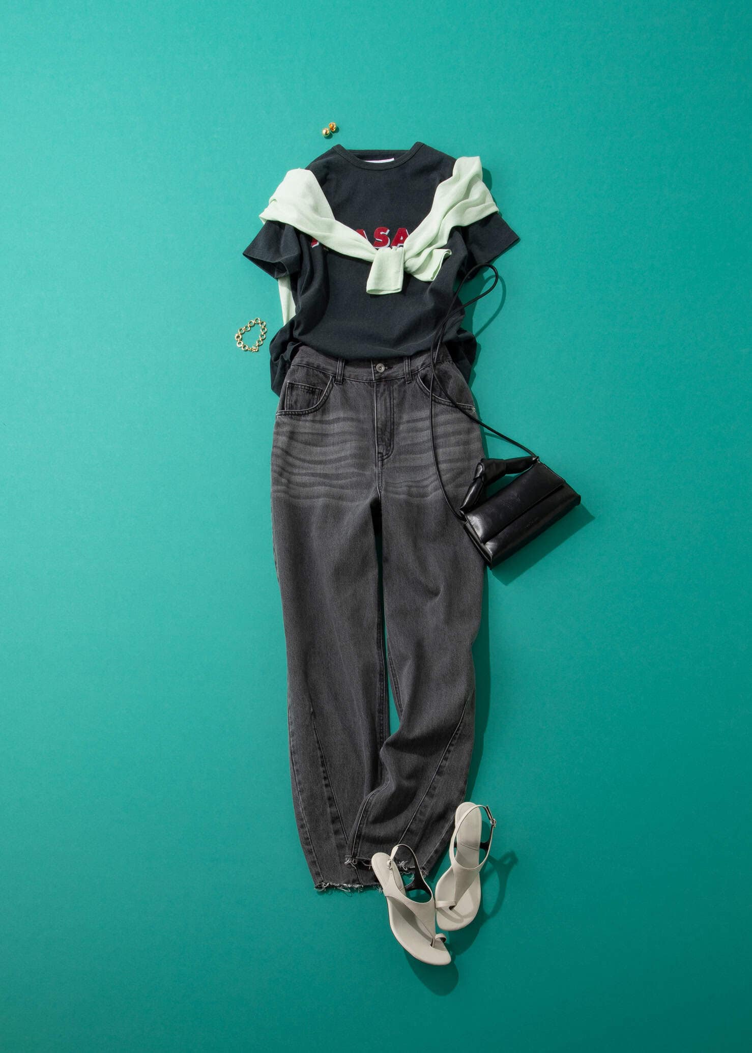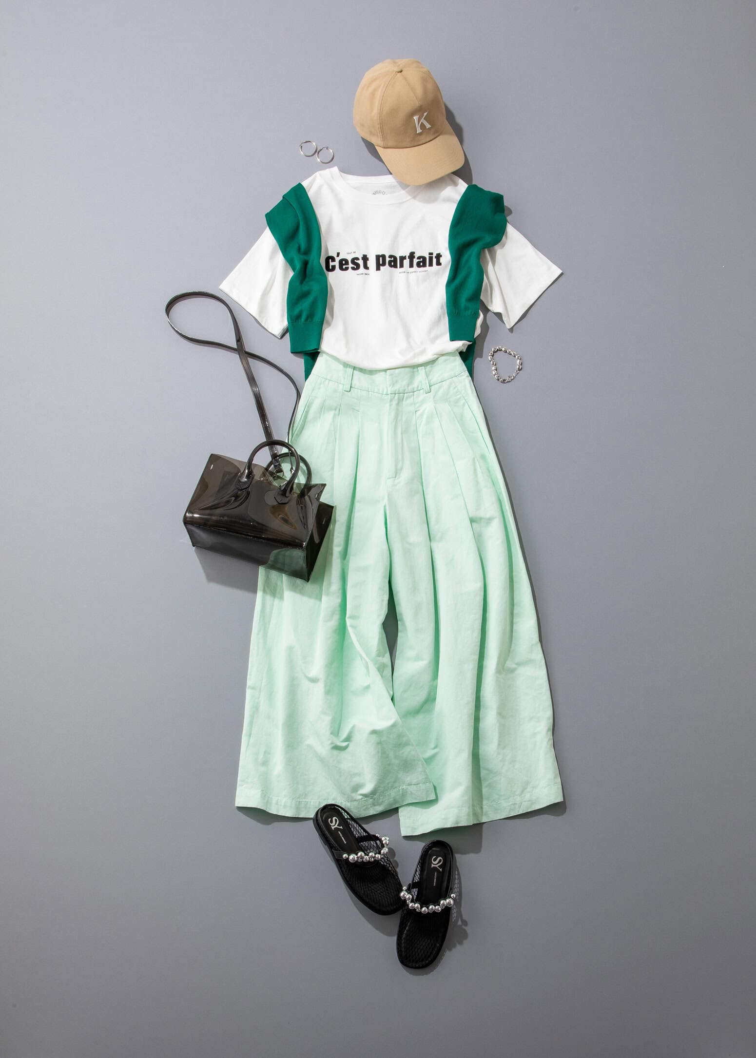 白ロゴTにグリーンを効かせて爽やかさ満点!ミント色のパンツで涼し気に。黒の小物で全体を引き締めあます