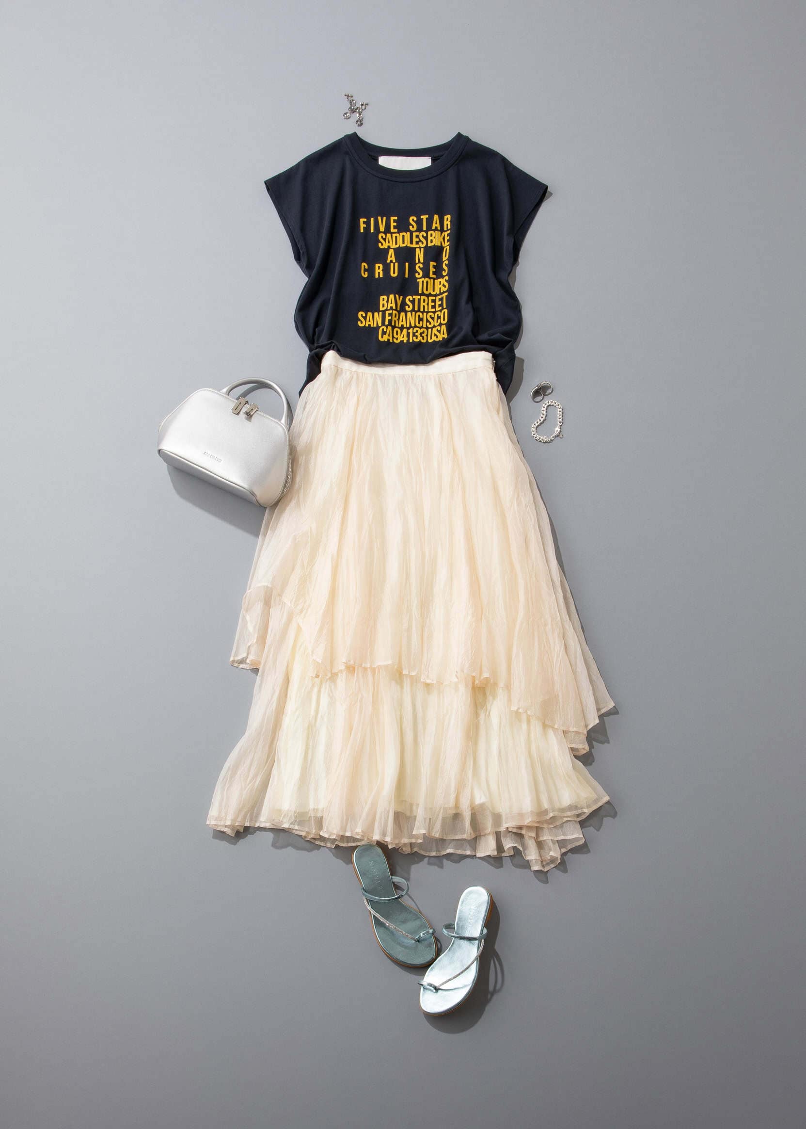 存在感のあるイエローロゴTは透け感スカートで女っぽさをON。夏の陽気なムードにぴったり。