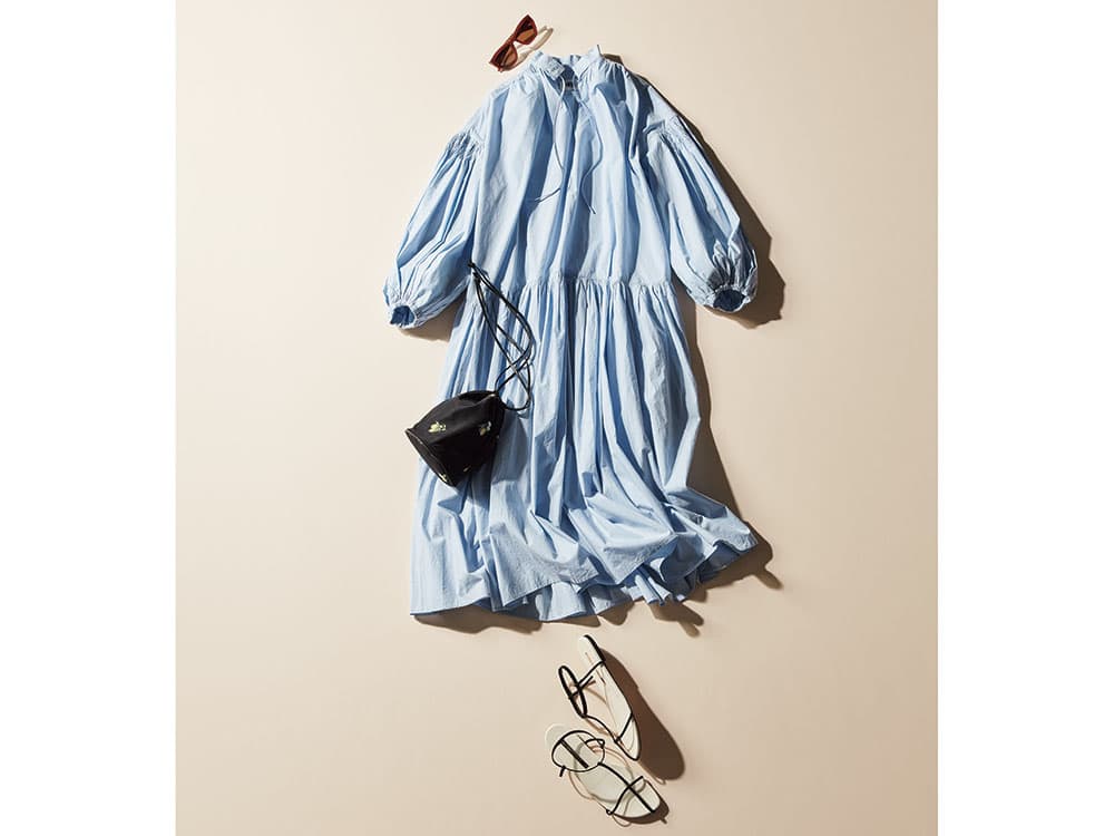 エアリーなカフタンで開放感を楽しんで。存在感のあるカフタンは水色で軽やかにし、袖をたくし上げて抜けを出しつつ、小物を黒で引き締めればタウンにもスッと馴染みます。リゾートでは、カラービーサン×カゴバッグのカラーオンカラーもオススメです。