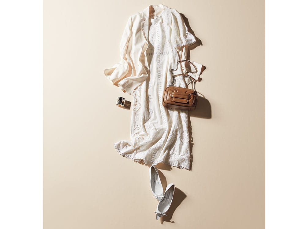 白のワントーンで場に馴染む清潔感を。白レースは清潔感がある分、コンサバに転びがち。堅すぎないシャツ感覚のハオリで着崩せば、TPOをわきまえつつ、洒落た印象に。小ぶりのレザーバッグとシルバーバングルでスタイリッシュに仕上げて。