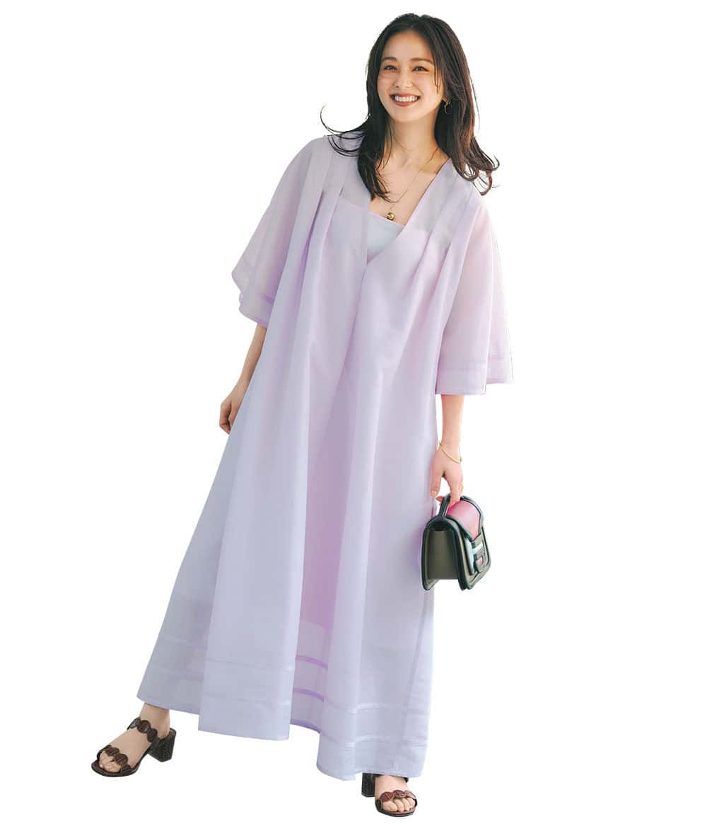 <モデル>ワンピース¥66,000(LE PHIL/LE PHIL NEWoMan 新宿店)バッグ¥187,000(ピエール アルディ/ピエール アルディ 東京)サンダル¥30,800(ツル バイ マリコ オイカワ)ピアス¥59,400(コンプリーテッドワークス/デ・プレ)ネックレス¥31,900(ミショー/ハウス オブ ロータス)バングル¥46,200(マリハ)ダブルフィンガーリング[左手人差し指・中指]¥20,900(イットアトリエ/フォーティーン ショールーム)リング[左手薬指]¥9,680(フル・オブ・グレイス/ズットホリック)