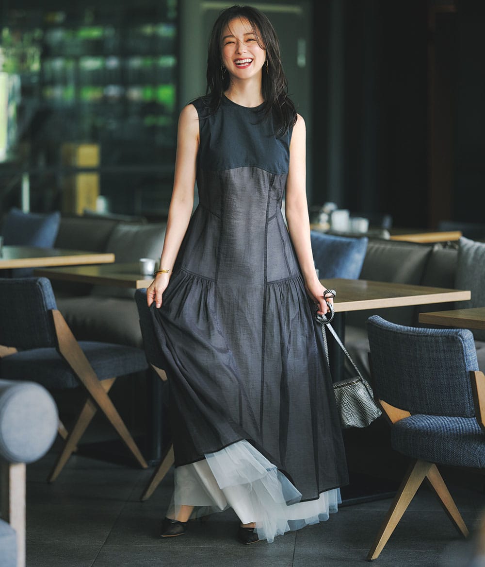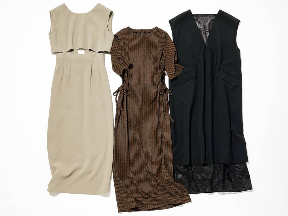 〈右〉背中と裾に部分使いのレースが大人。控えめに肌見せしたい人にオススメ。ワンピース¥60,500(アドーア)〈中〉ウエスト部分のカッティングが横姿をヘルシーに。ワンピース¥14,960(ビューティー&ユース/ユナイテッドアローズ 渋谷スクランブルスクエア店)〈左〉トップスを外せばサスペンダーSKとしても着用可。ワンピース¥39,600(ルシェルブルー/ルシェルブルー総合カスタマーサービス)