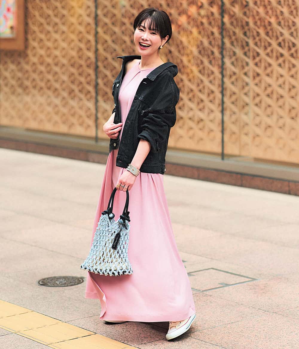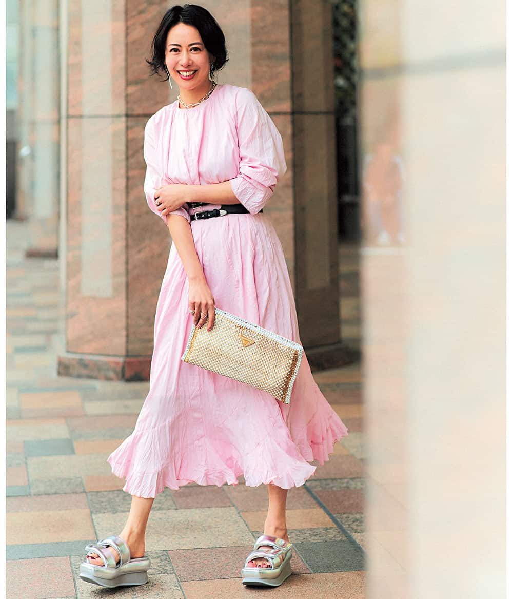 思い切ってトライしたトラッツォ ドンナのピンクのワンピ、辛口の小物をアクセントに。動きのある素材なら大人っぽく着こなせます。