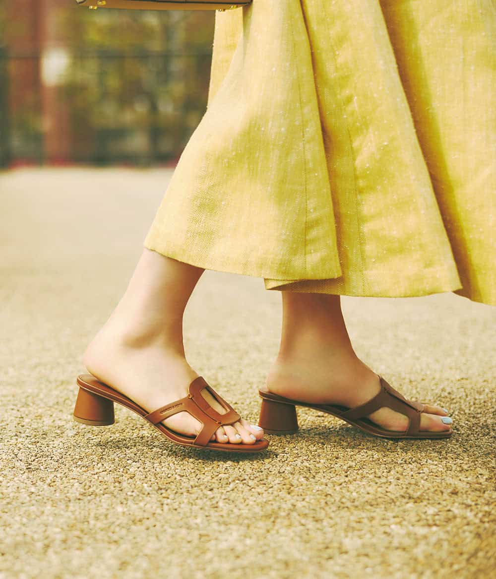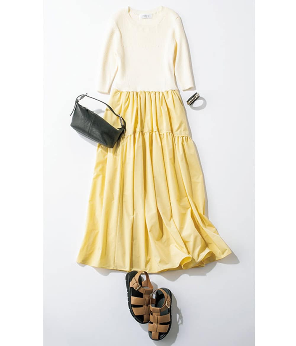 ワンピース¥23,100(アルページュストーリーオリジナル)バッグ¥121,000レザーブレスレット¥47,300(ともにJ&M デヴィッドソン/J&M デヴィッドソン カスタマーセンター)サンダル¥24,200(2.718/ガリャルダガランテ 青山店)