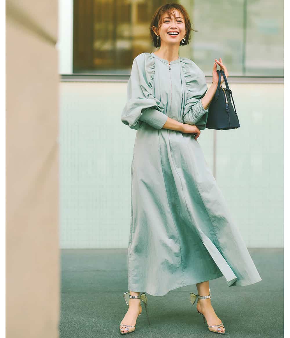 北海道から九州まで広がる〝映えカラー前線〟が圧巻! 各地域のきれい色を着こなす街映えカラースタイルには、過ごし方や気分にも、それぞれの都市ならではの特徴が。今回は名古屋読者に人気の高かった【くすみグリーン】のワンピースをご紹介します。