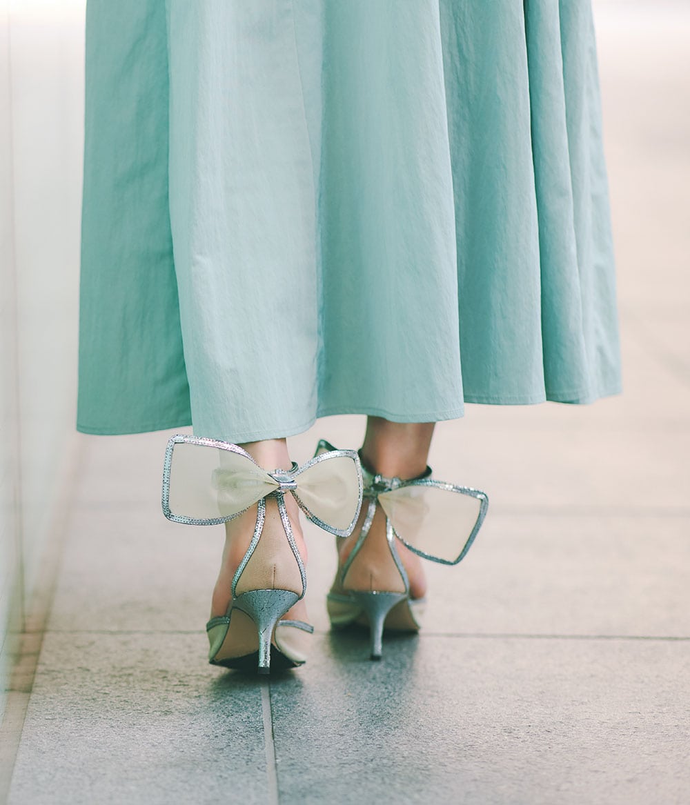 女性らしい小物を合わせる時は、曲線的でフェミニンなデザインのワンピを選ぶと、雰囲気に統一感が出て◎。