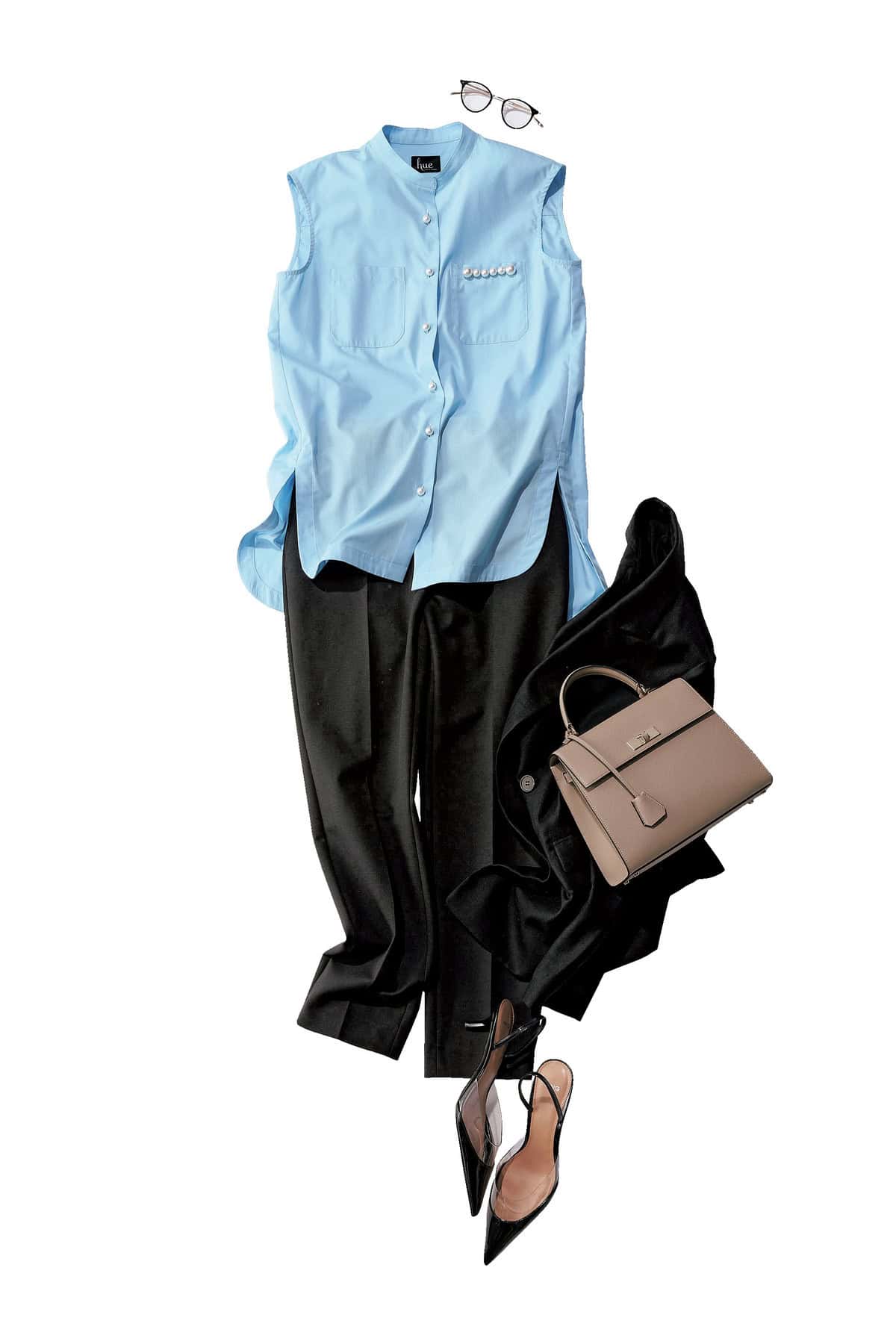シャツ¥52,800(ヒュー・デイ・トゥ・イブニング)パンツ¥9,990(プラステ)ジャケット¥42,900(マルティニーク/マルティニーク ルミネ横浜)バッグ¥253,000(ボナベンチュラ/ボナベンチュラ カスタマーサポート)パンプス¥9,990(MANGO)メガネ¥48,400(アイヴァン/アイヴァン 東京ギャラリー)