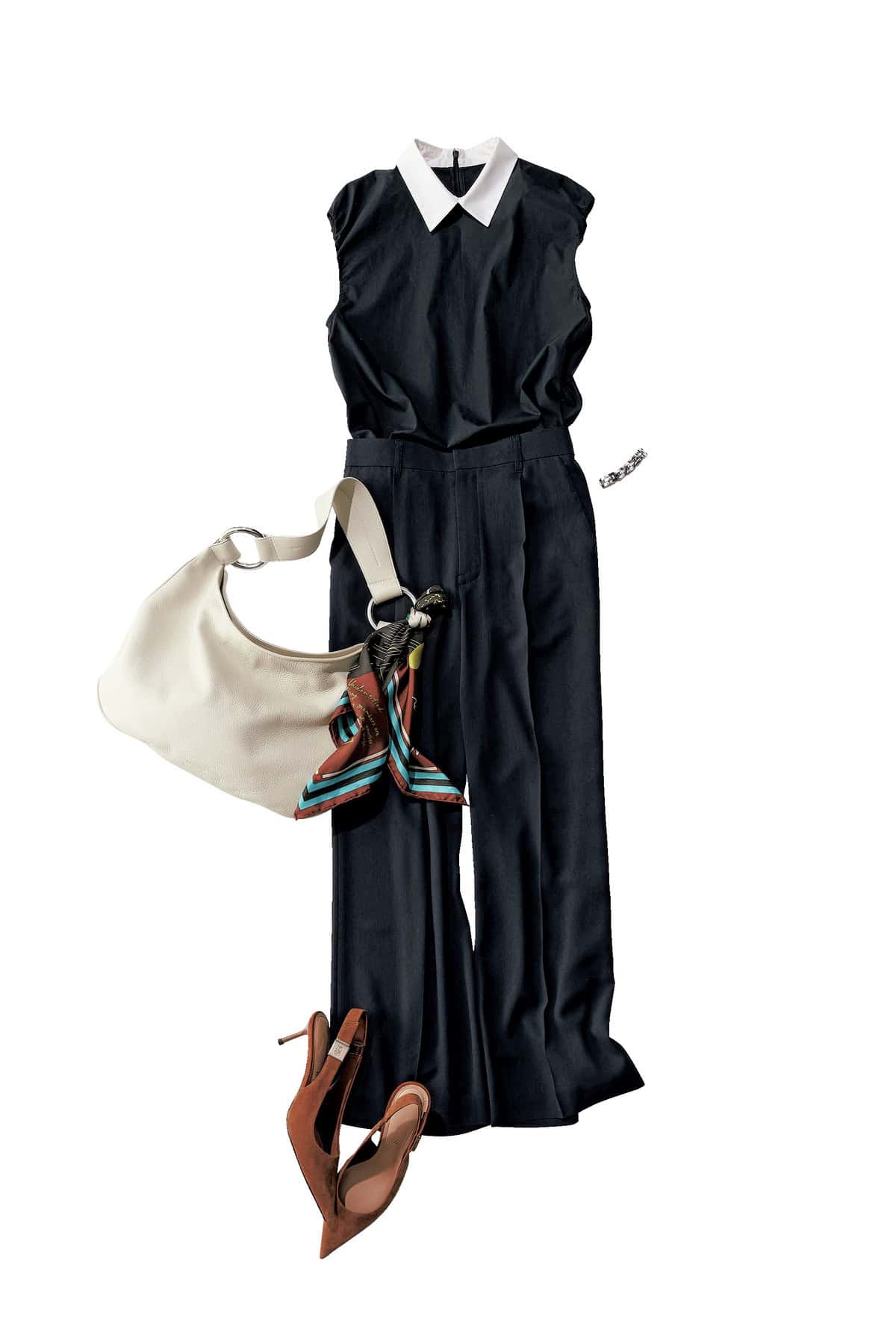 ネイビーブラウス¥22,000(マルティニーク/マルティニーク ルミネ横浜)ネイビーパンツ¥20,900(ティアラ)バッグ¥198,000(J&M デヴィッドソン/J&M デヴィッドソン カスタマーセンター)スカーフ¥16,500(マニプリ)パンプス¥14,900(チャールズ&キース/チャールズ&キース ジャパン)ブレスレット¥132,000(ウノアエレシルバーコレクション/ウノアエレ ジャパン)