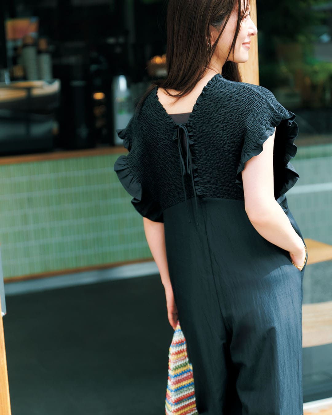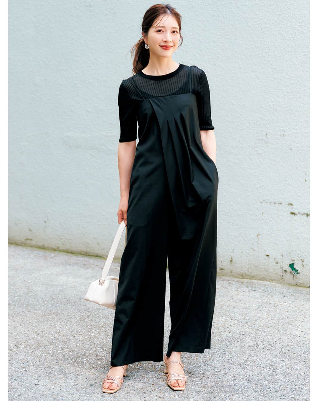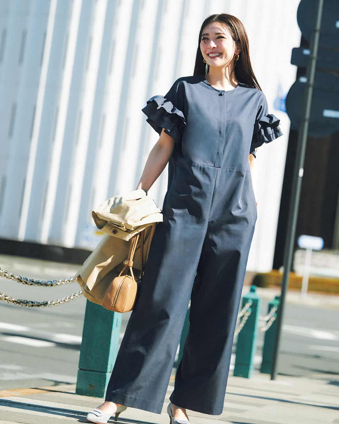 オールインワン¥24,200(プライオリティ)バッグ¥39,600(マニプリ)シューズ¥13, 200(アルテミス byダイアナ/アルテミス byダイアナ アーバンドック ららぽーと豊洲店)サングラス¥49,500(エーシーカーニー/ソスト)ピアス¥77,000〈ミチ ウィルウェイ〉リング¥20,900〈イットアトリエ〉(ともにフォーティーン ショールーム)