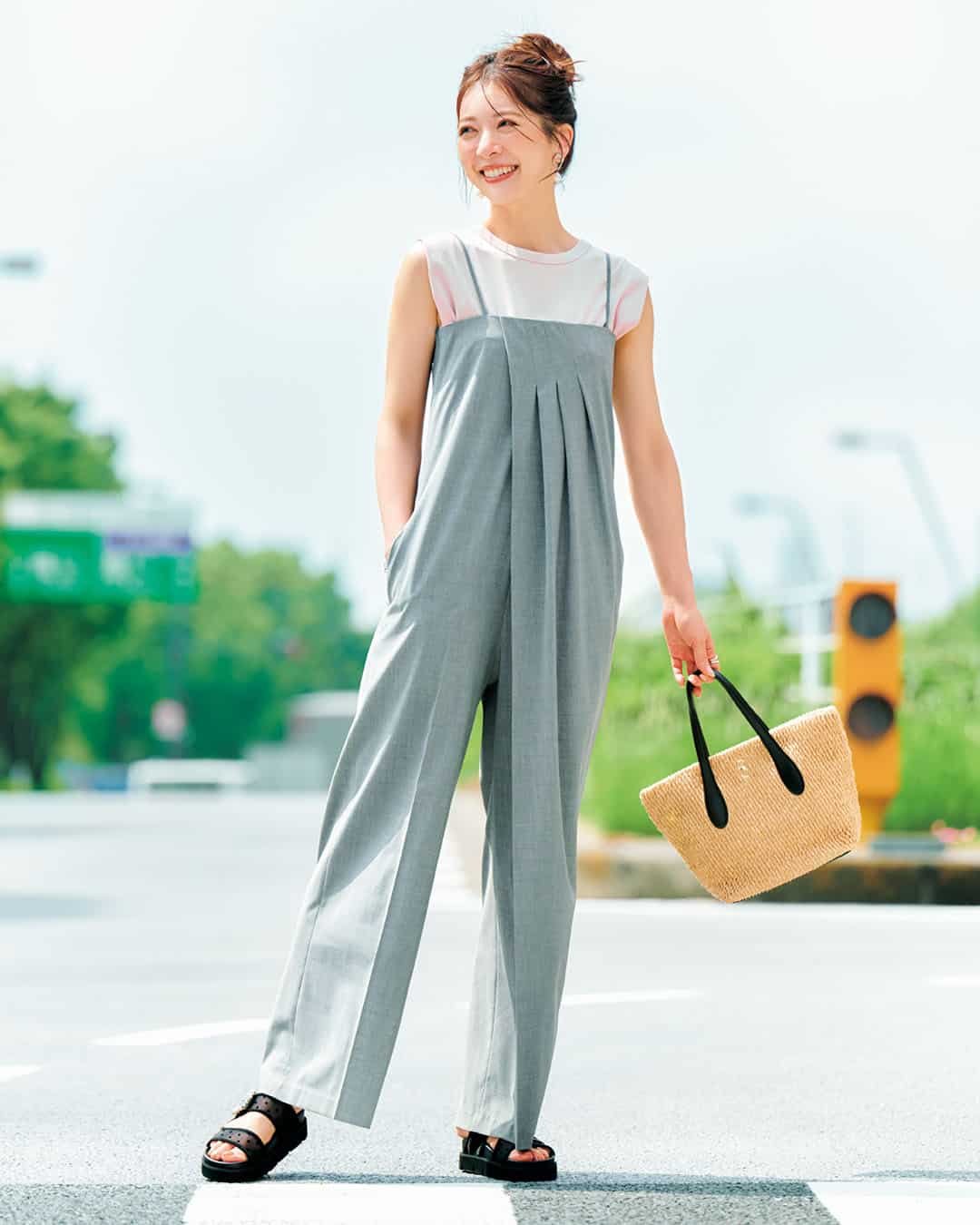 オールインワン¥6,498(リエディ)タンクトップ¥5,990(アンフィーロ/アンフィーロ〈オンワード樫山〉)バッグ¥6,490(ギャップ)イヤリング¥6,820〈イットアトリエ〉ブレスレット¥13,200〈ミチ ウィルウェイ〉(ともにフォーティーン ショールーム)リング¥61,600(ココシュニック)シューズ/スタイリスト私物