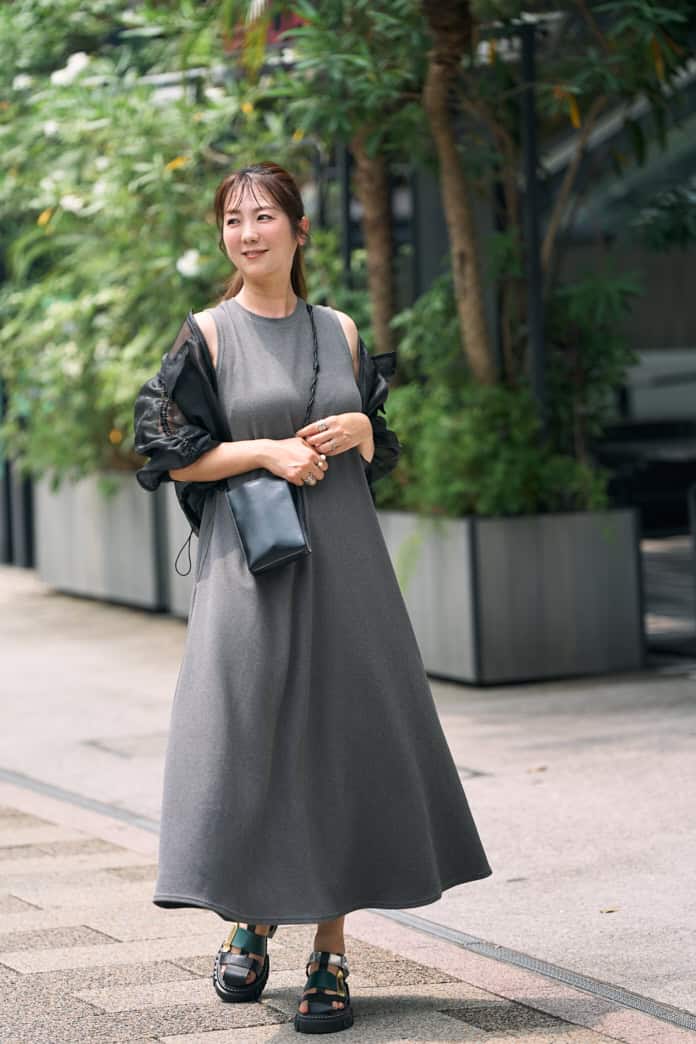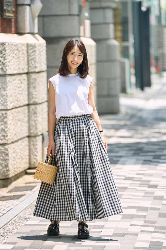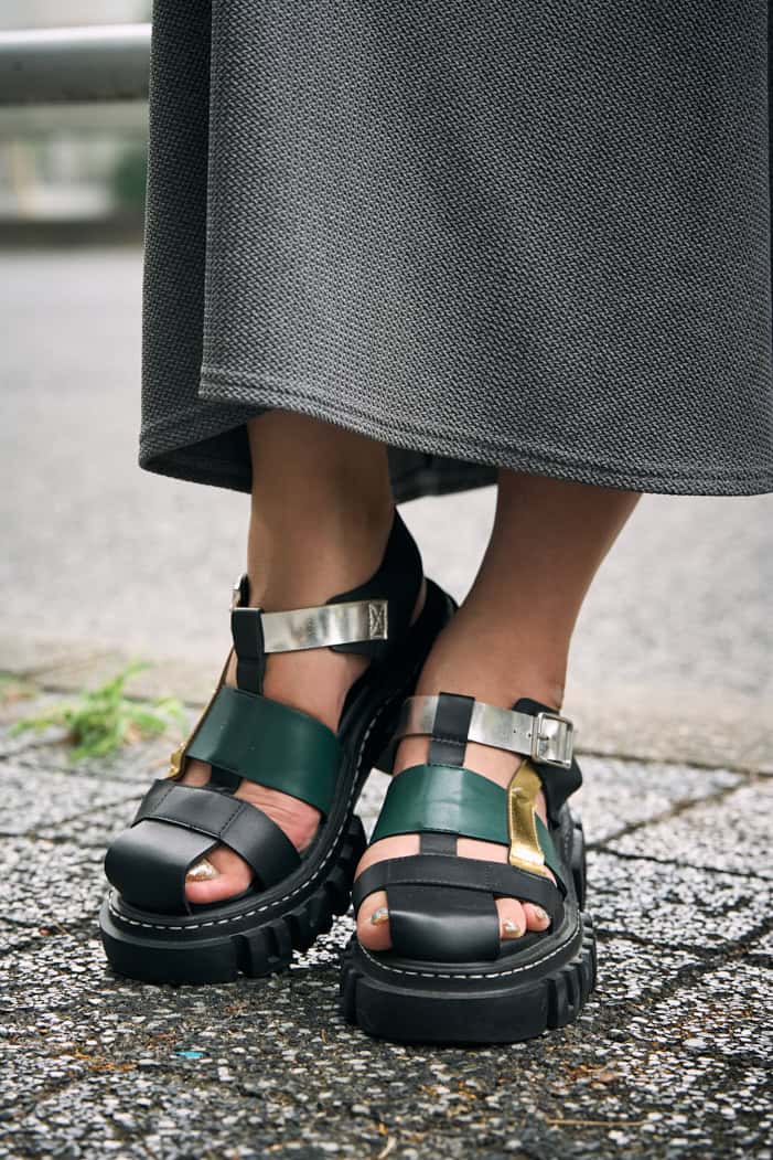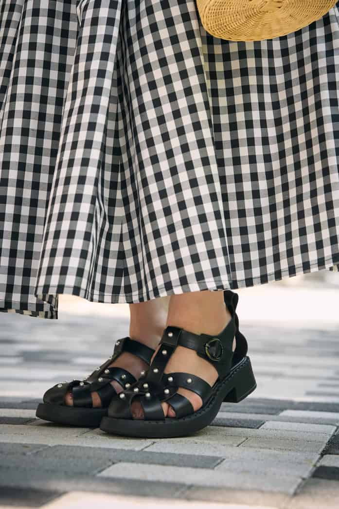 甘めやきれいめなコーデに、ほどよいカジュアル感を添えてくれる王道のブラックカラーにスタッズがついているグルカサンダルは、今季も引き続き大活躍!足元に抜け感が加わることで、こなれた印象になって◎。カジュアルに寄りすぎないよう、女性らしいスカートを合わせて大人バランスを意識しました。ウエストはインしてメリハリを出しつつ、スカートで気になる下半身を自然にカバー。ソールに厚みがあるので、スタイルアップ効果も期待できるのが嬉しいポイントです。