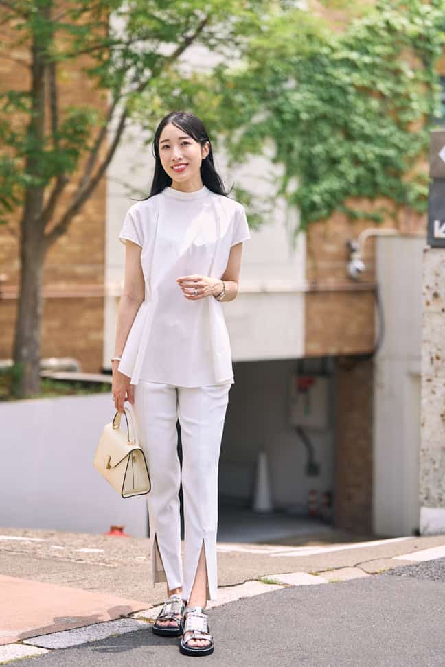 シルバーのサンダルは、足元に抜け感と華やかさをプラスしてくれるので夏に大活躍!厚底ソールでナチュラルなスタイルアップが叶い、歩きやすさも抜群でお気に入りの一足です。パンツの裾に入ったスリットからサンダルがのぞくことで、脚長効果と美脚見えスタイルに。全身を白でまとめて、軽やかさと上品さのあるワントーンコーデに仕上げました。