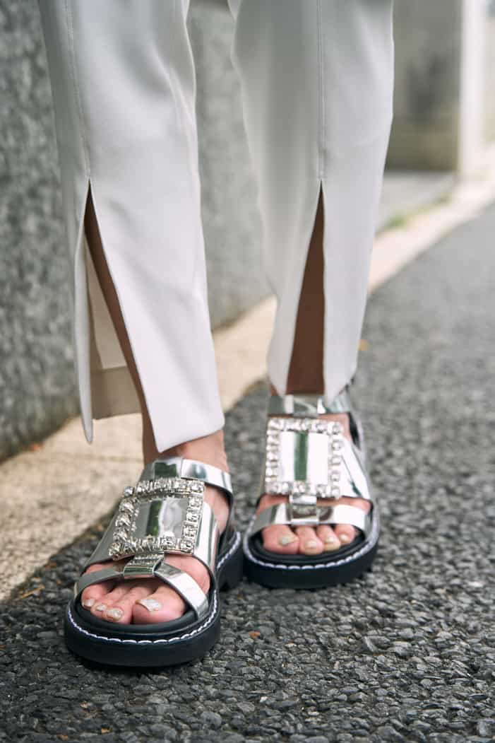 シルバーの足元で抜け感と華やかさをプラス。ワントーンコーデを格上げ!