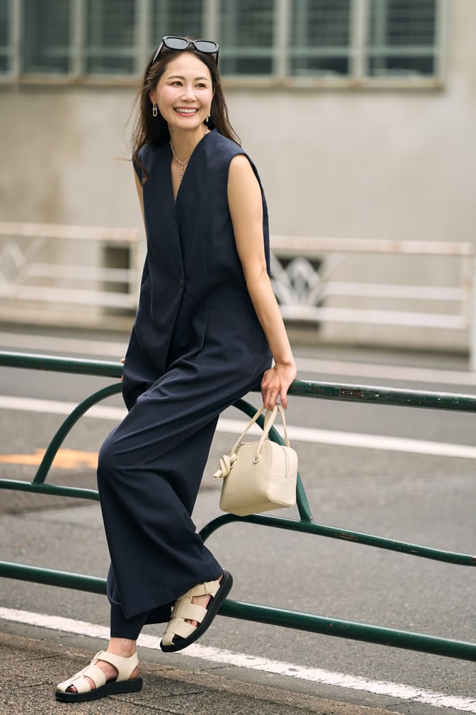 柔らかなレザーが心地よいグルカサンダルは、爽やかなホワイトで夏らしさと抜け感をプラスしてくれる一足。ブランドロゴのないミニマルなデザインは、クワイエット・ラグジュアリーを感じさせ、大人のリュクス感を演出できるところもお気に入りです。今年らしさを意識して、タイトではなくワイドなシルエットのオールインワンをセレクトしました。シンプルながらも上品さを意識しつつ、大人の夏のリラックスコーデ。