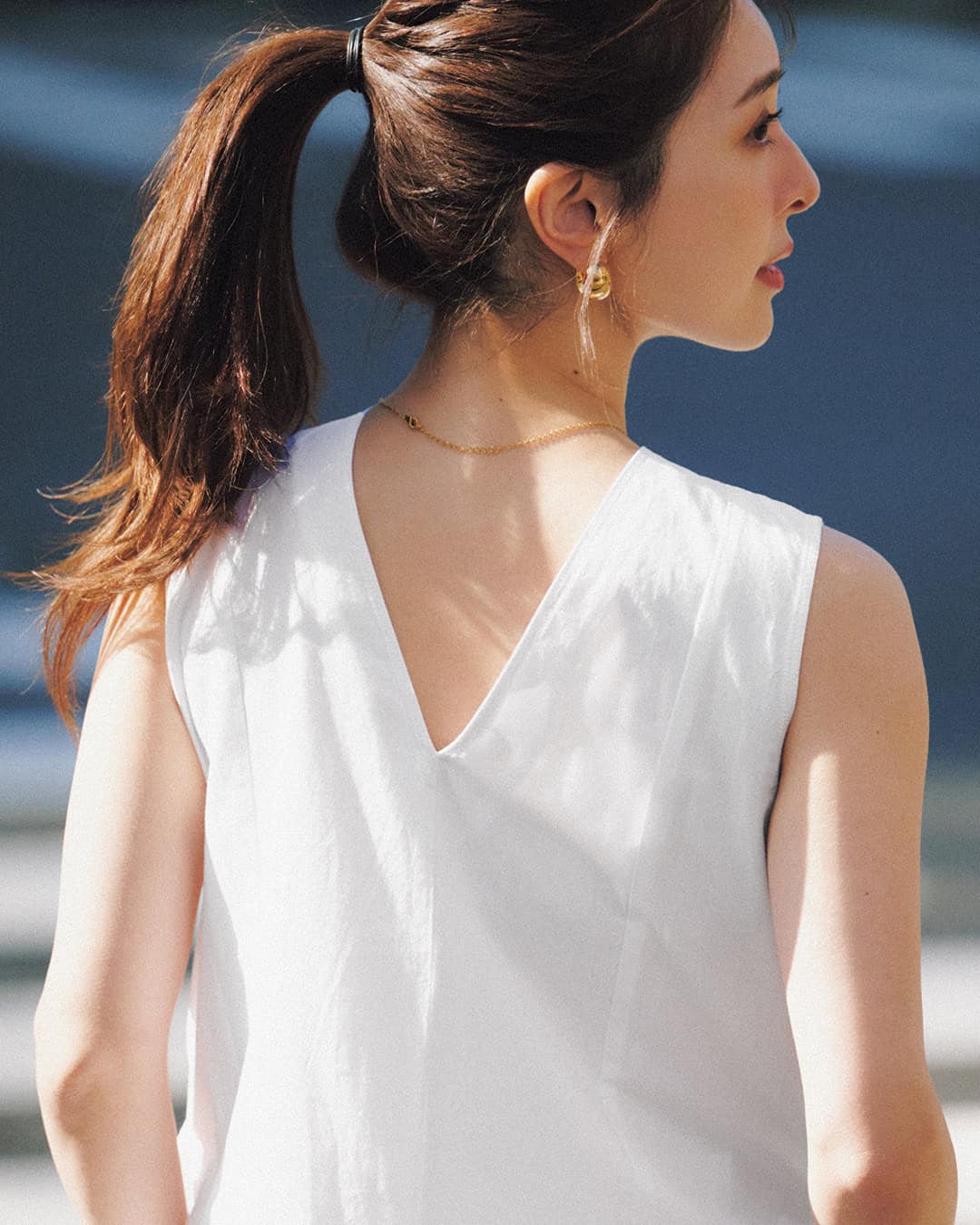 深めのVネックが印象的なドライタッチ素材のギャザーオールインワン。背中に施されたリボンがフェミニンなバックスタイルを作り出します。リゾートや通勤など小物次第でシーンに馴染む万能な1着。