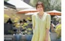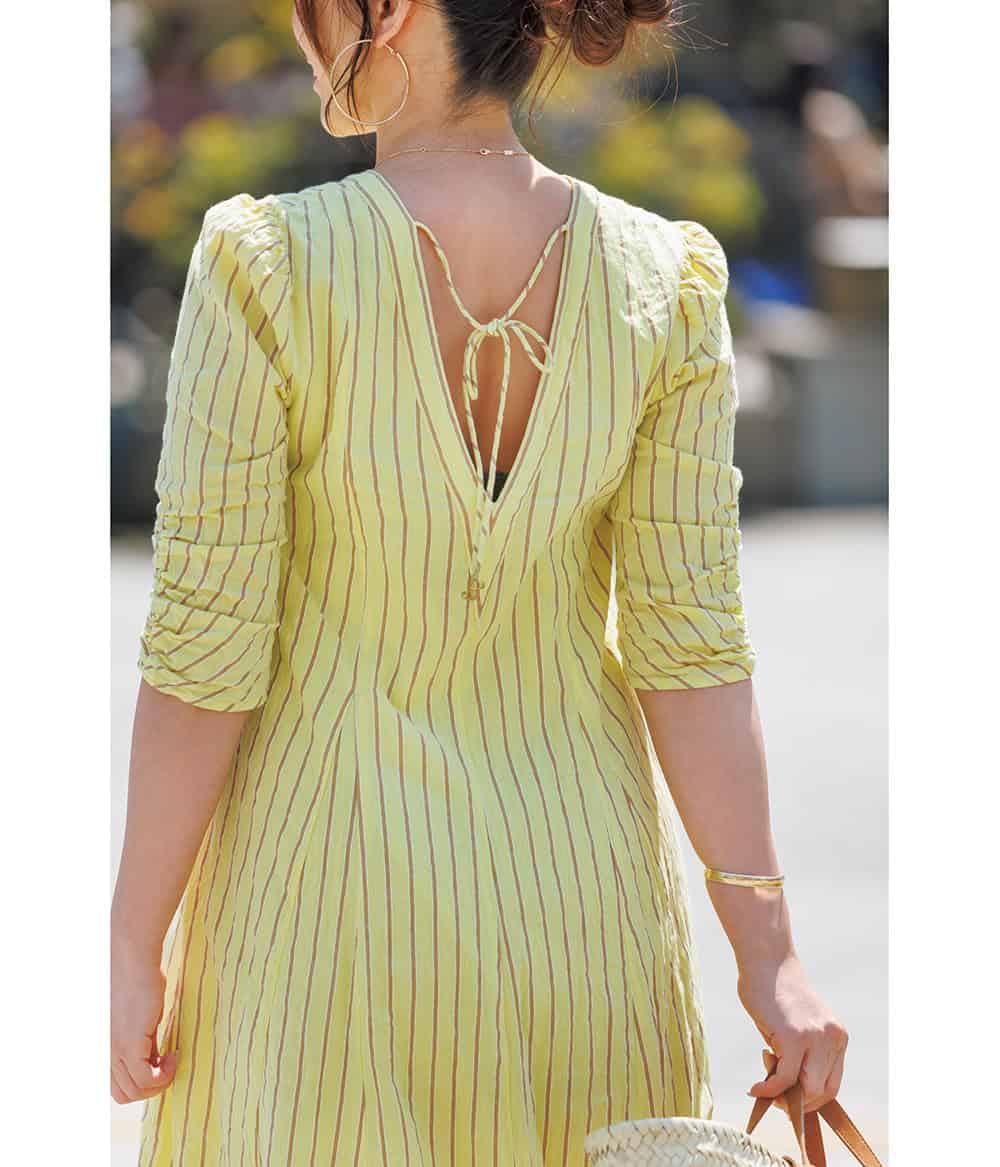アメスリ・背中チラ見せワンピは、好きなパーツである二の腕と背中をキレイに見せてくれるカッティングデザインとライムカラーに一目惚れ。ショートヘアに華奢な体型でも異素材なら女っぽさも足してくれるから気分も上がります。