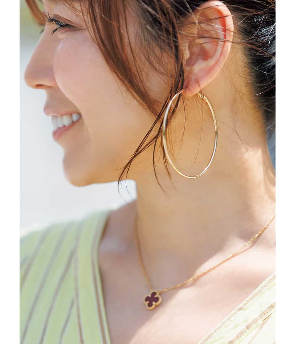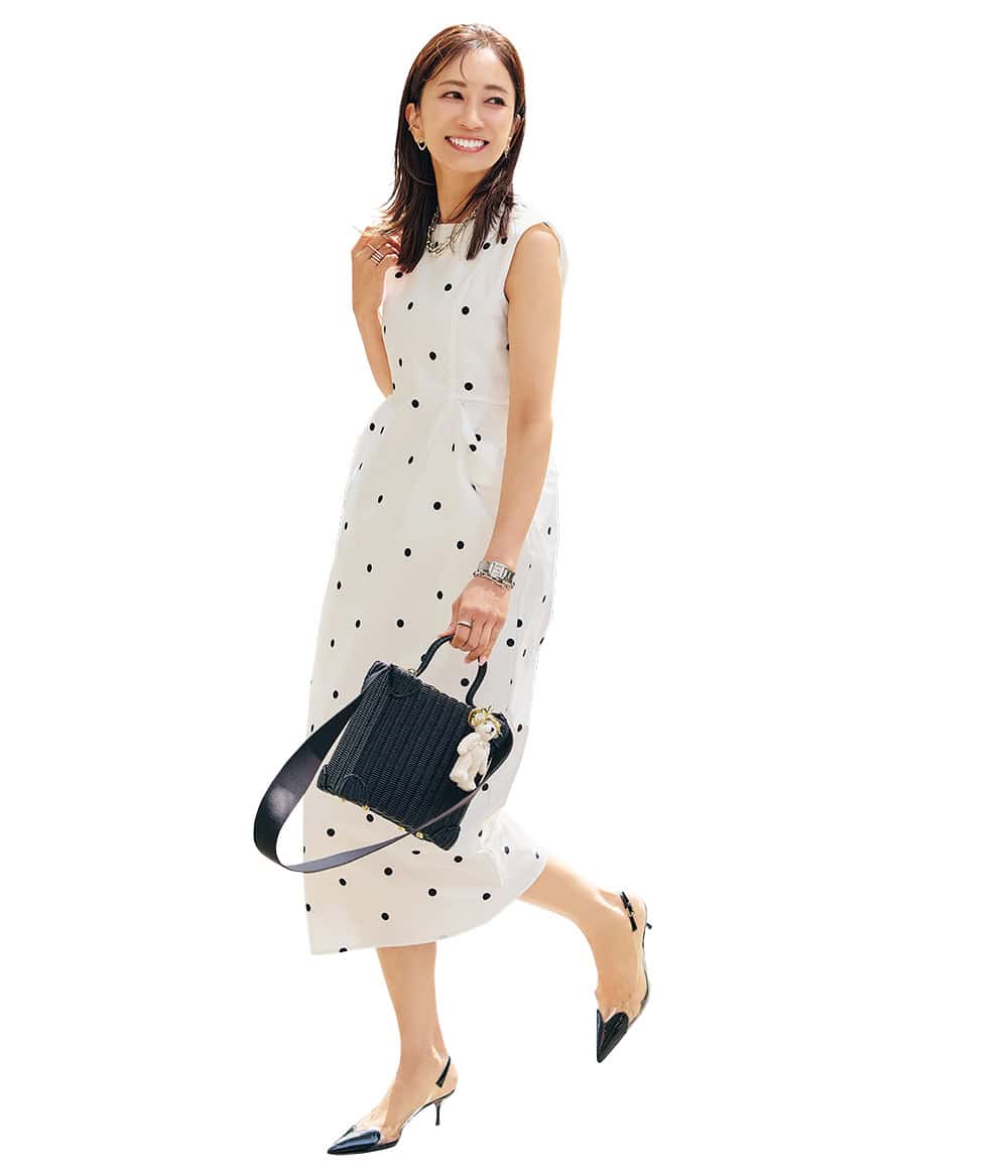 前から見ると上品で、たっぷりのフレアがエレガントな印象に。後ろから見ると背中が大胆に開いているギャップが新鮮で目を奪われました。ミスコンでドレスをキレイに着るために背中を鍛えたので、今年は背中開きがドラマティックなケイスズキのワンピースに挑戦しました。ここぞという時の一張羅ワンピースは、ホテルでの女子会や夜飲みで大活躍。着ると背筋もピンと伸びて、母でも妻でもない自分を取り戻せる気がして非日常を楽しんでいます。