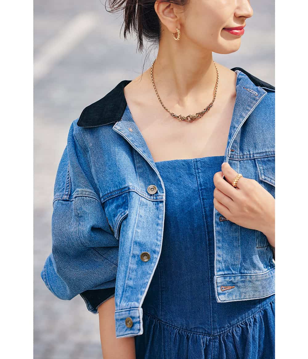 デニムの素材感を活かしたラフさでビスチェワンピがこなれて見える!